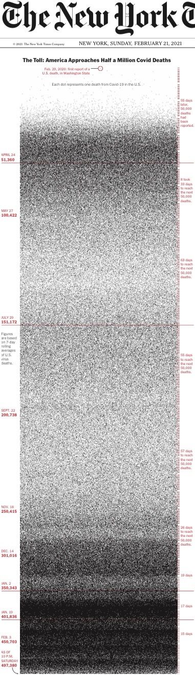 Today's N.Y. Times front page ... "The Toll: America Approaches Half a Million Covid Deaths" ... Each of these 497,380 dots represents one death: