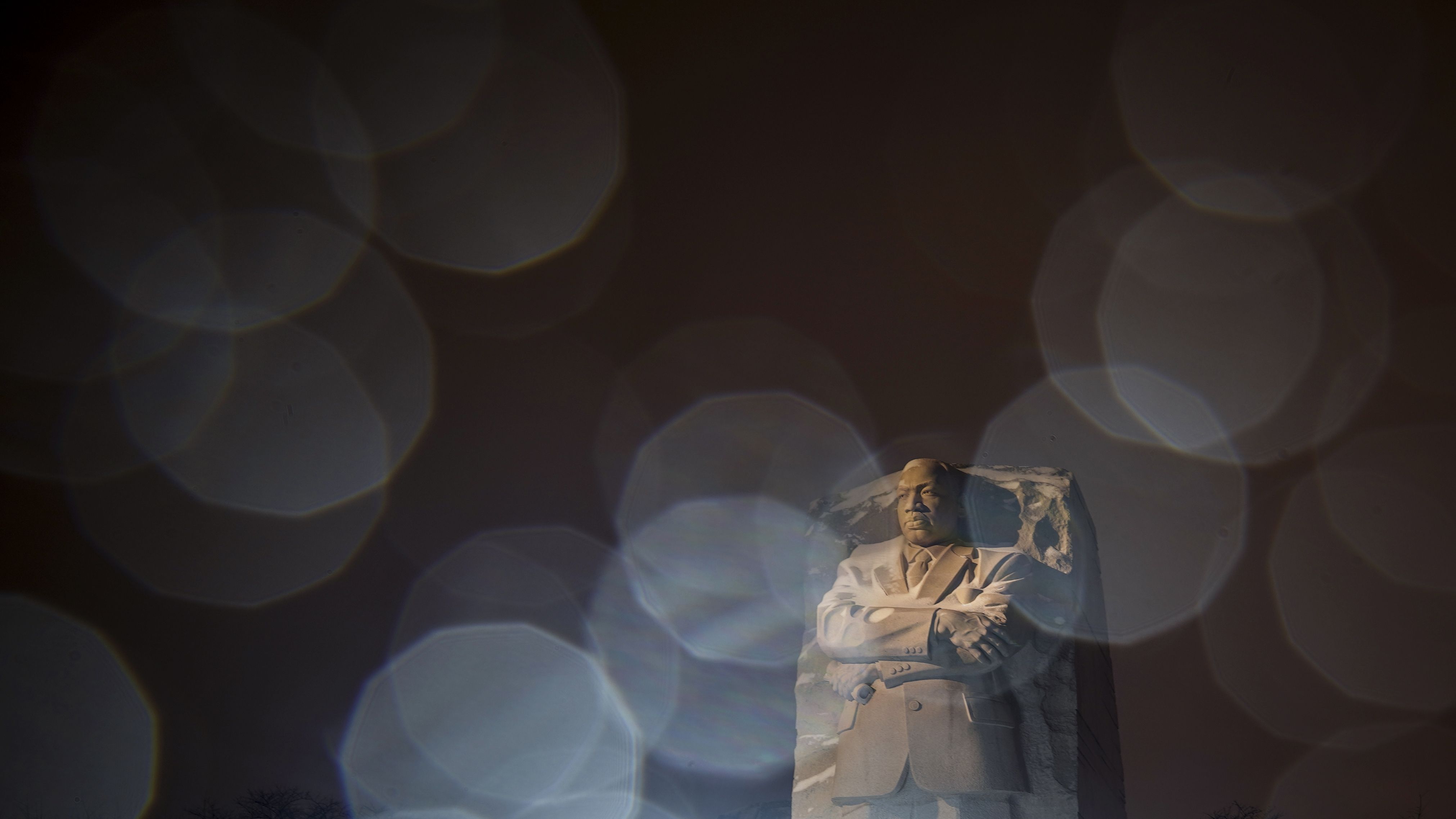 In a long-exposure photo, lights from a snowplow illuminate sleet last night at the Martin Luther King, Jr. Memorial in Washington.