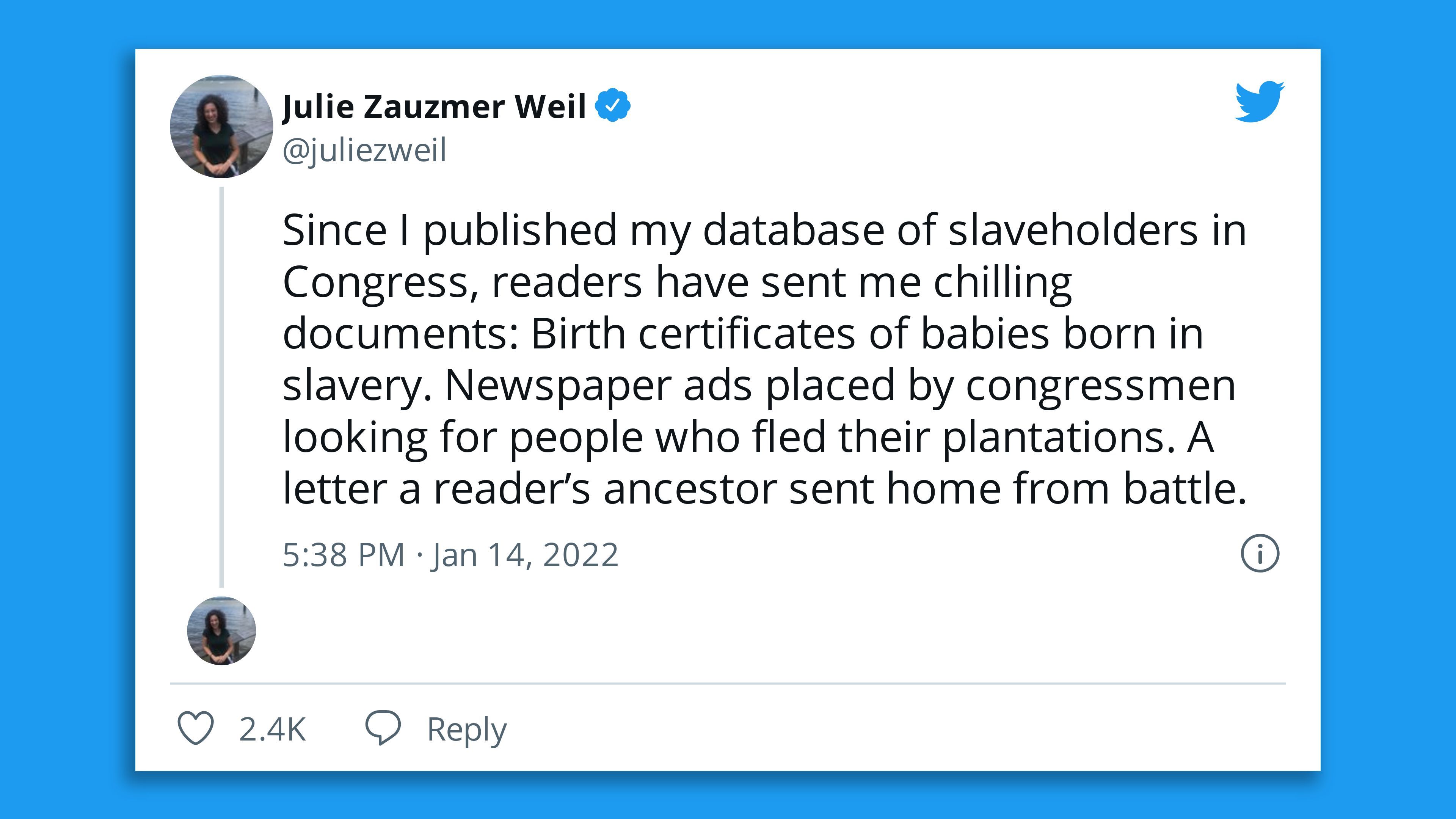 - Outside the paywall: The Post asks for help identifying members of Congress who enslaved people, with a checklist of lawmakers left to research, sorted by state.
