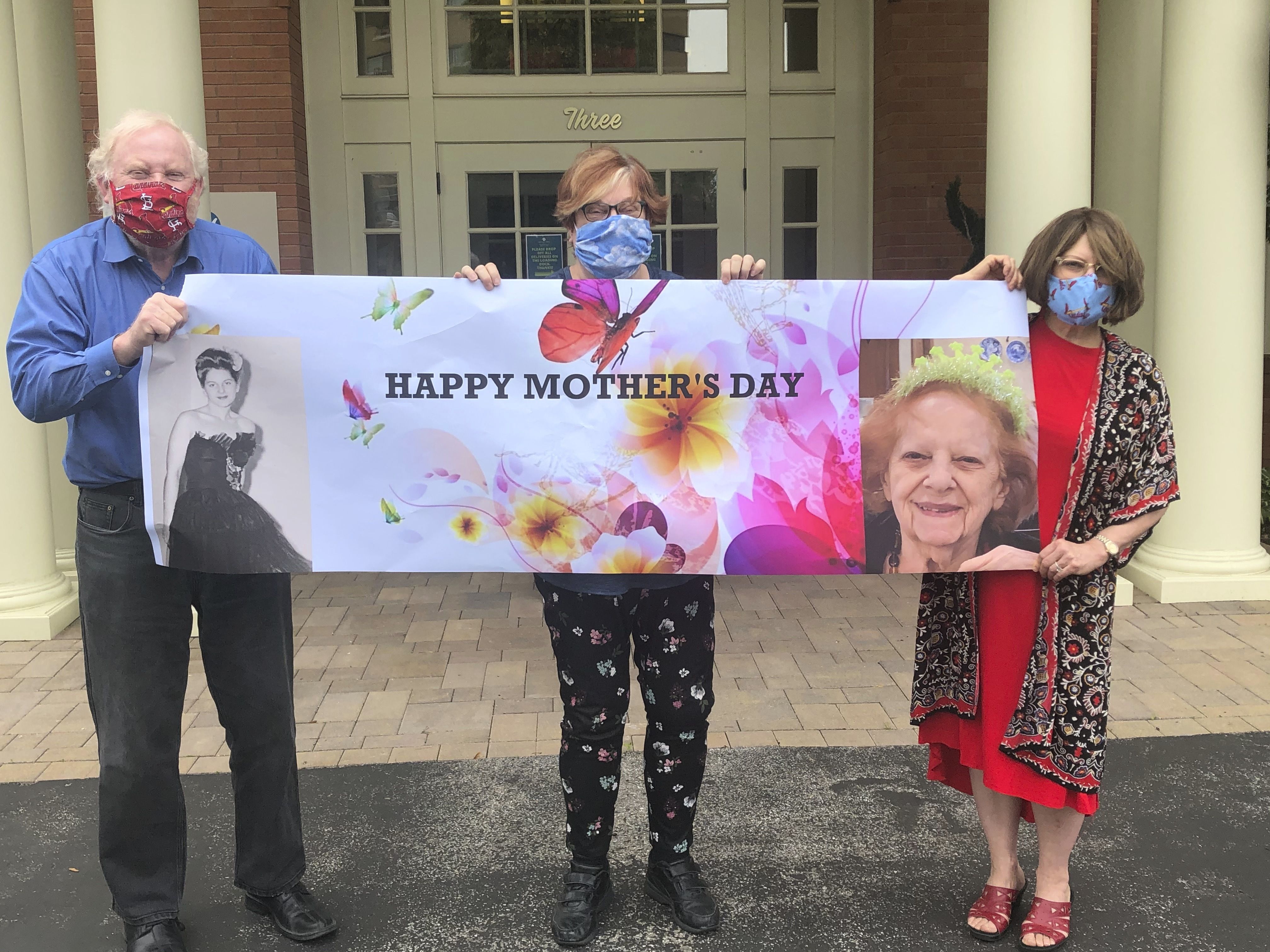 Steve Turner and his sisters, Carla Paull and Lisa Fishman, hold up a Mother’s Day banner emblazoned with images of their mom, Beverly Turner, in front of her assisted living facility in Ladue, Missouri. (A practice session for today!)