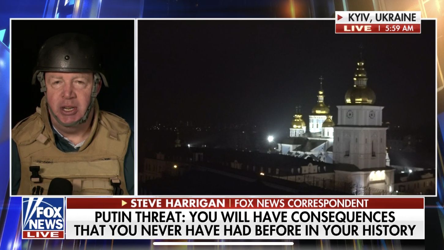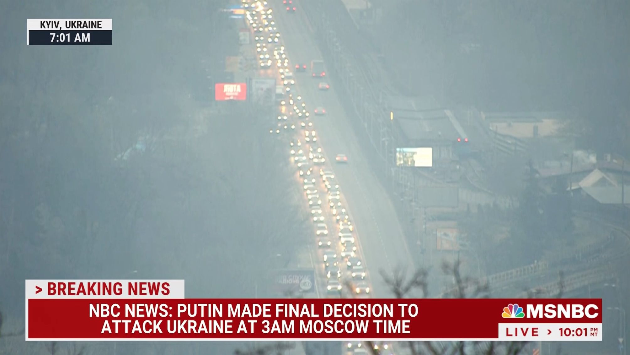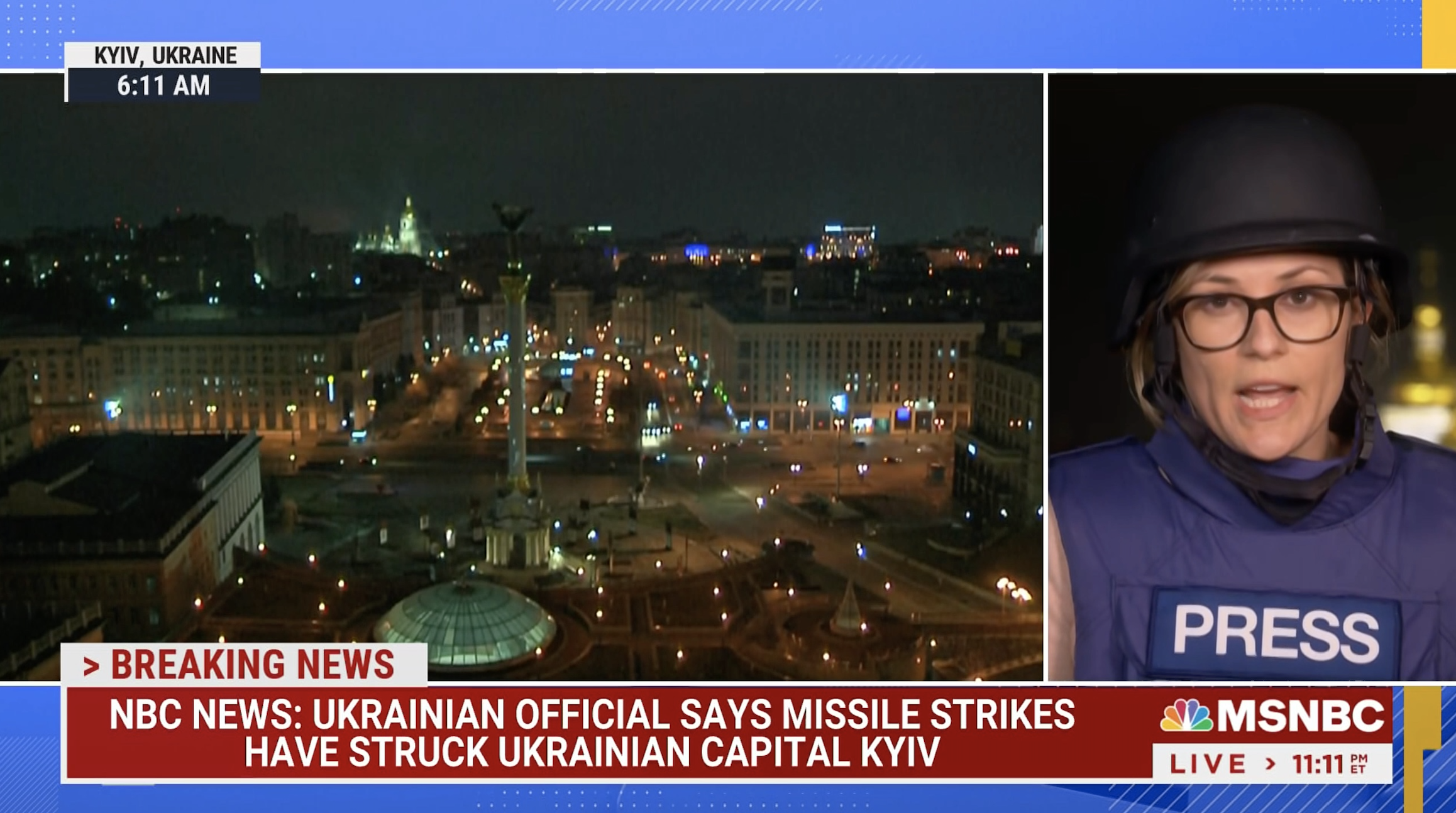NBC's Erin McLaughlin told viewers live throughout prime time about explosions from both sides of her in Kyiv. She was live on MSNBC at 12:05 a.m. ET (7:05 a.m. in Ukraine) when she heard the first sirens going off.