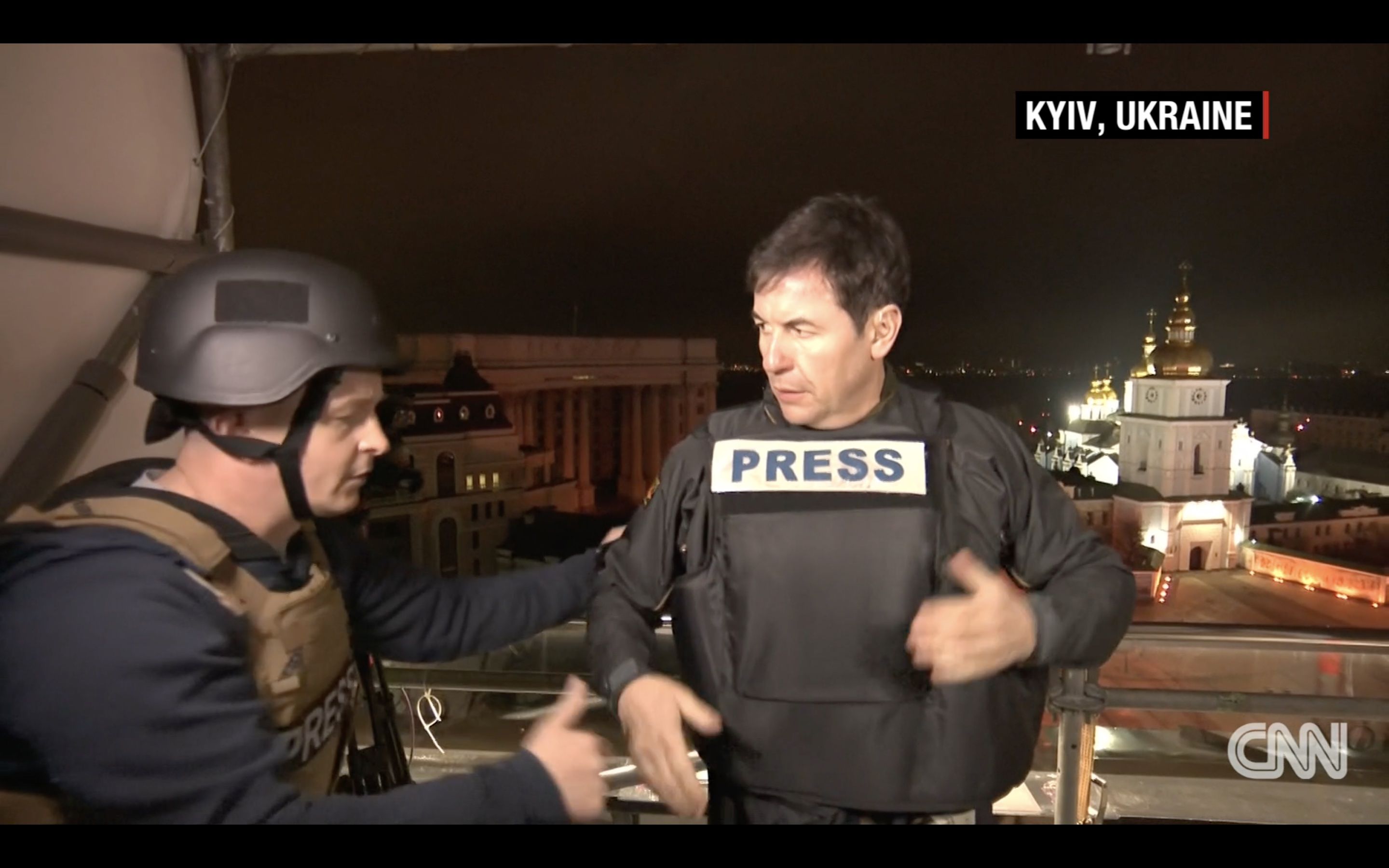 CNN's Matthew Chance was talking live with Don Lemon in U.S. prime time, from a roof in central Kyiv, when Chance said he heard "a big bang ... big explosions."