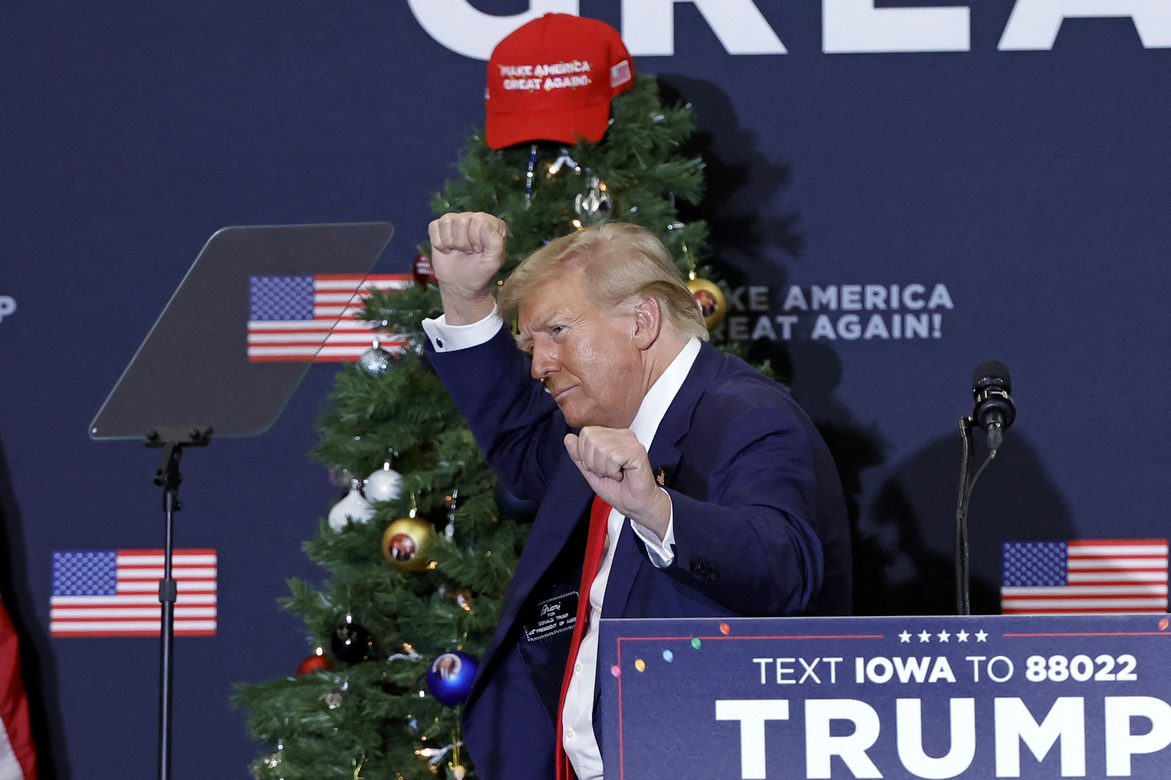 - "I never read 'Mein Kampf,'" Trump told 1,000+ supporters in Waterloo, Iowa, flanked by two big Christmas trees topped by red MAGA hats.