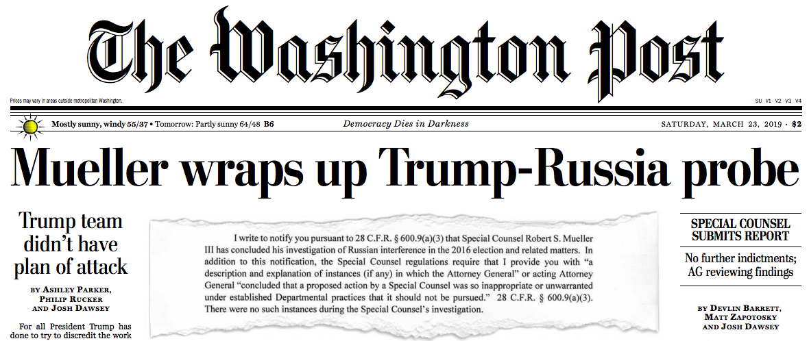 - The Trump/Fox victory dance because no one new was indicted for collusion or corruption involving Russia — and therefore claims of "witch hunts" and innocence were vindicated.