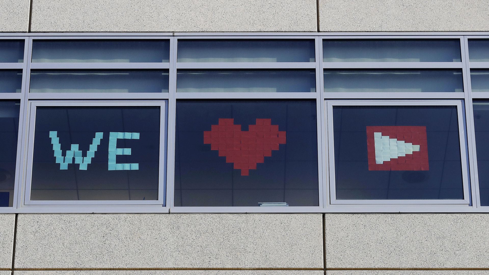 Sticky-note solidarity for YouTube, from a Walmart office in San Bruno, Calif. (AP's Jeff Chiu)