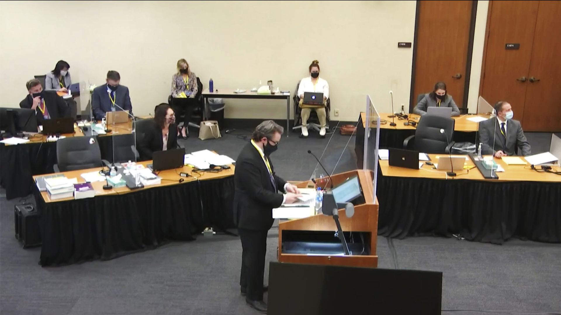 Defense attorney Eric Nelson questions a witness. Derek Chauvin is at far right. Photo: Court TV via AP