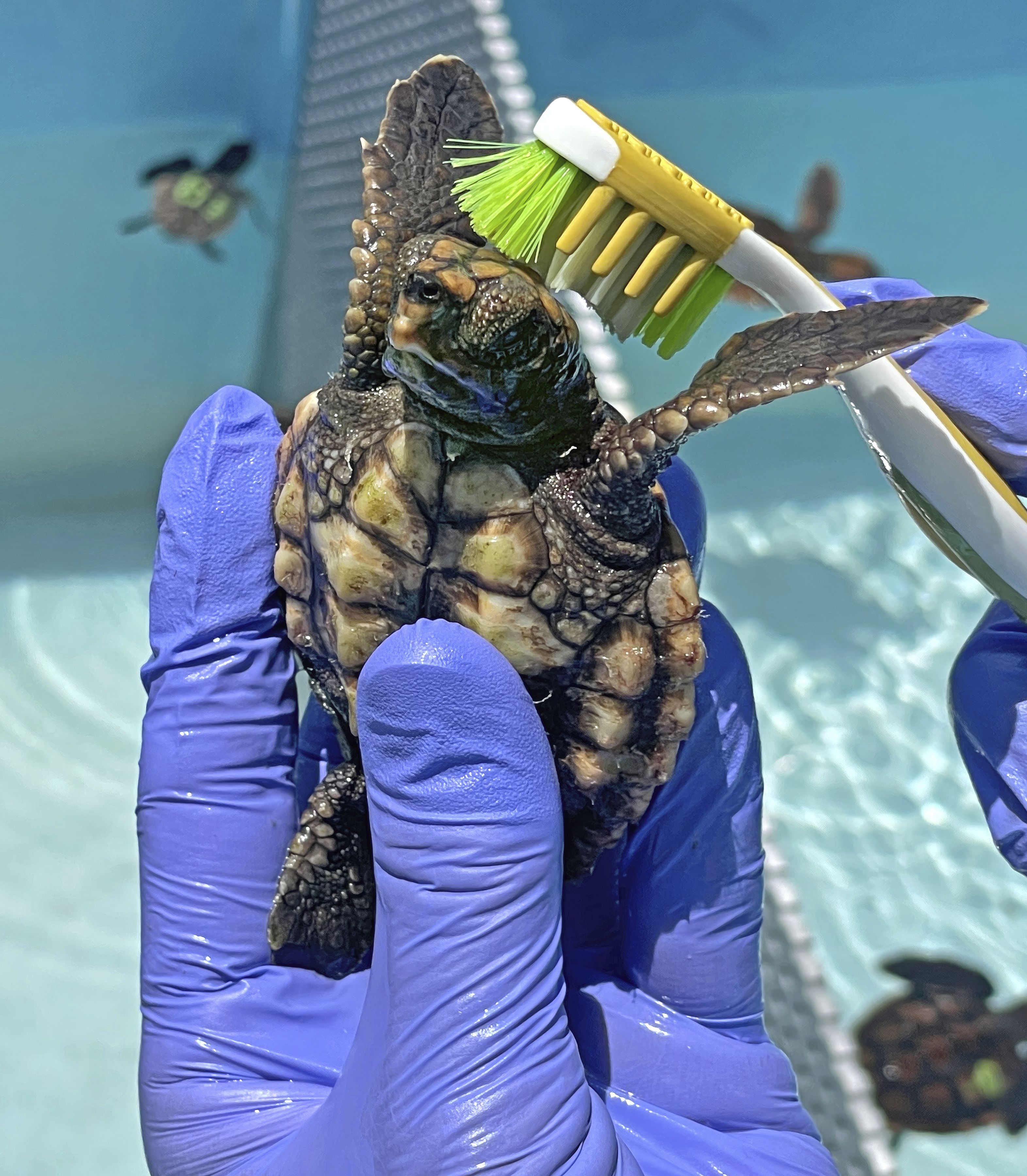 This toothbrush is cleaning algae off a loggerhead sea turtle yesterday at the Turtle Hospital in Marathon, Fla.