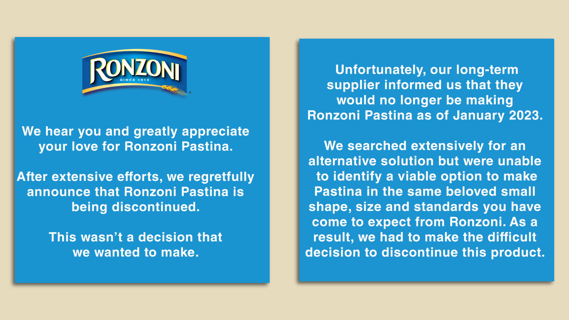 Ronzoni announced plans to discontinue its pastina — a tiny variety of pasta — because it cannot find a supplier.