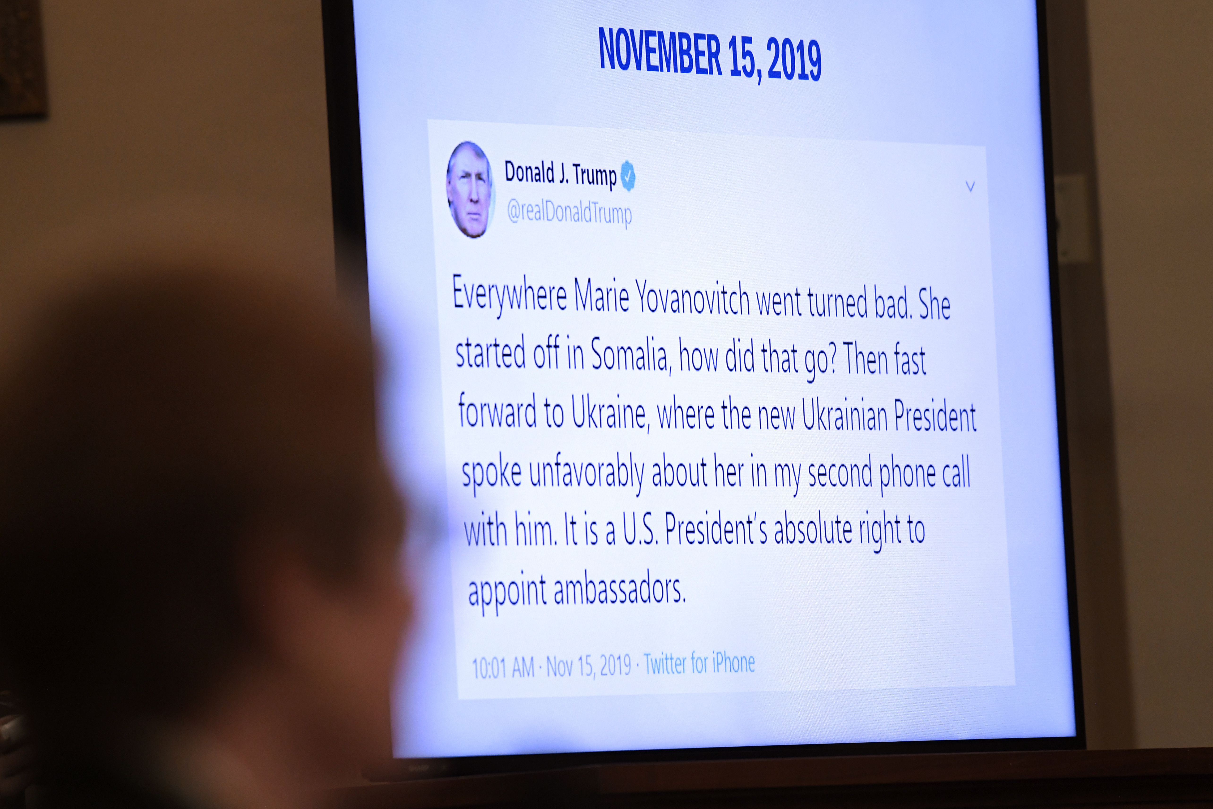 - The tweet was displayed on monitors as Yovanovitch continued testifying: