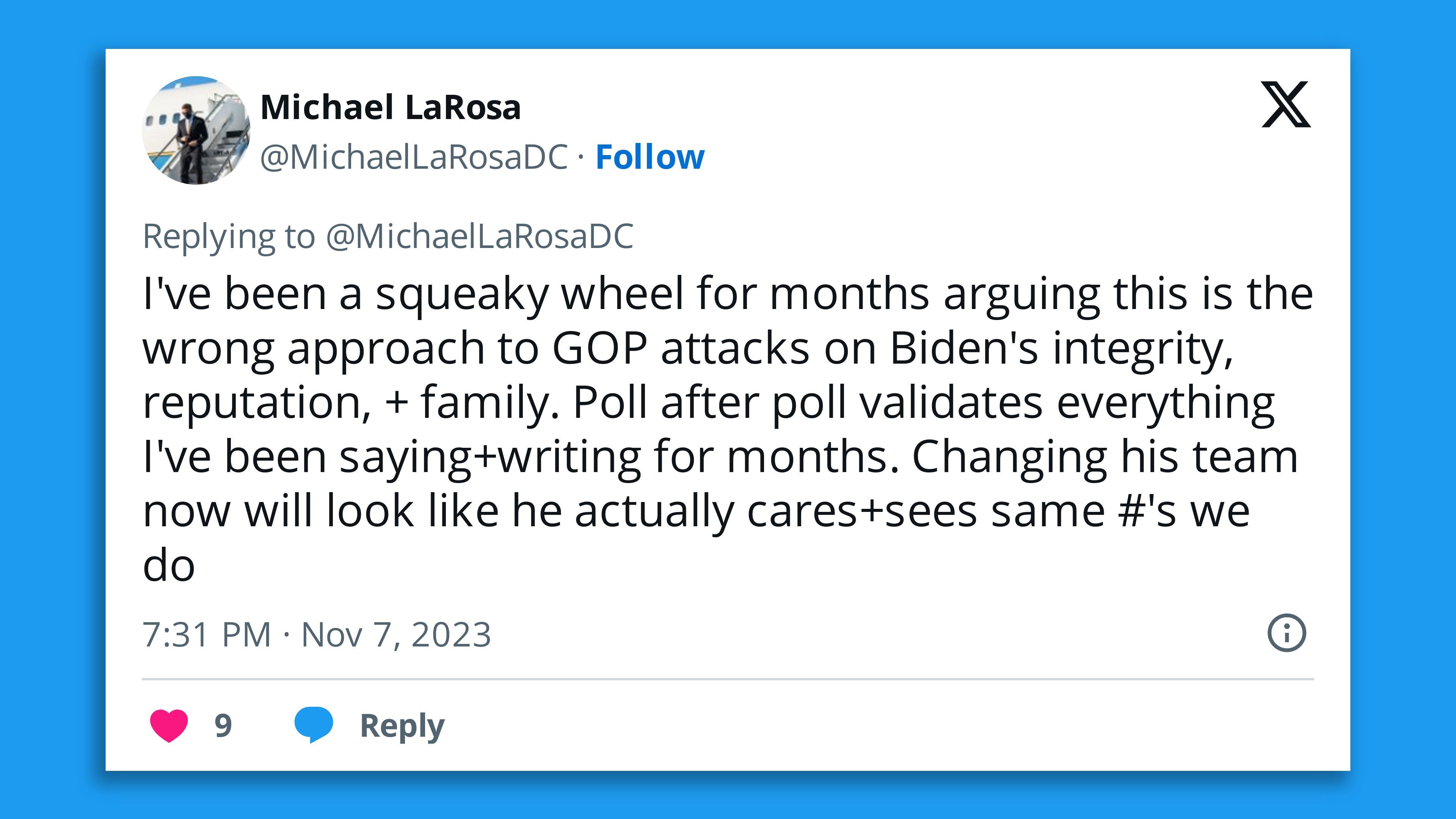 The Biden sources are all talking because the former staffer, Michael LaRosa — former press secretary to First Lady Jill Biden, and special assistant to the president — broke the Biden code of silence, and has repeatedly mocked Biden's campaign strategy on cable TV and social media.
