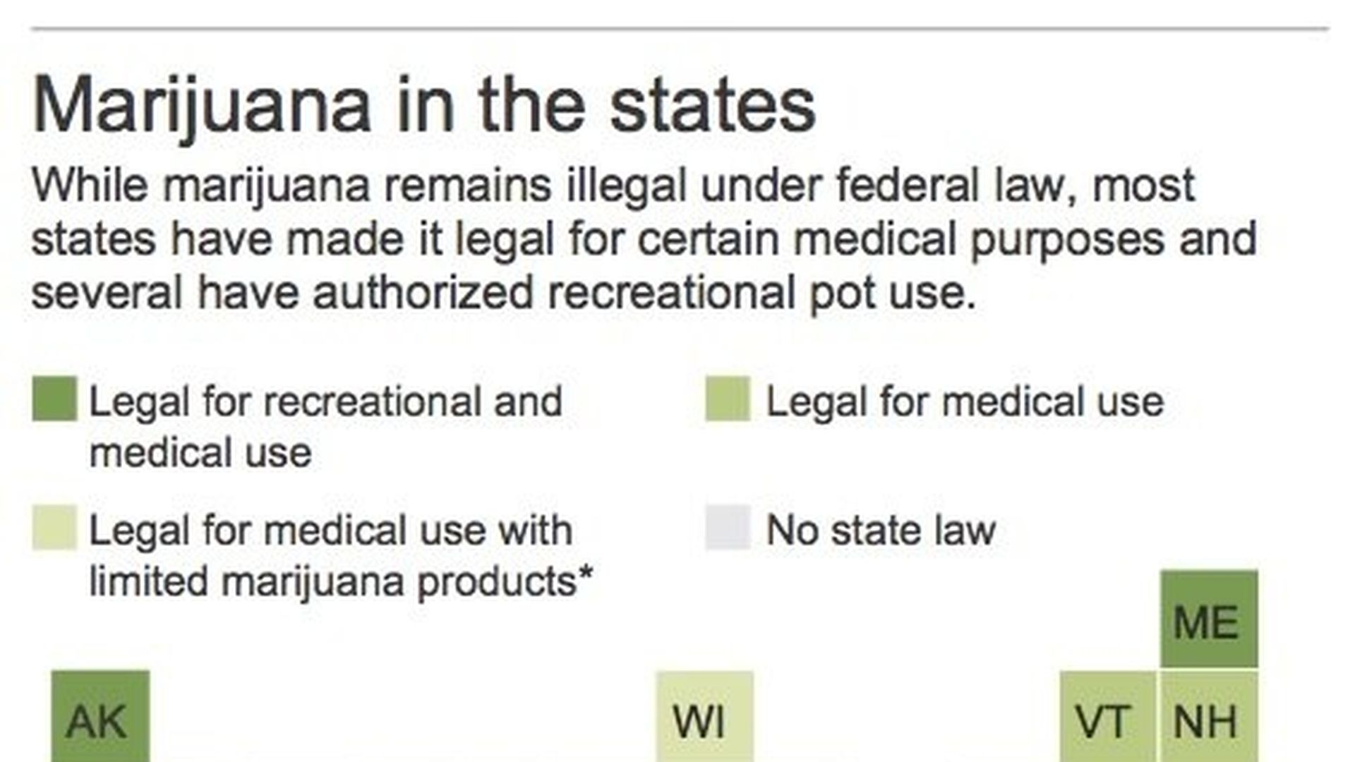 - "The declaration renewed anxiety, confusion and uncertainty that has long shadowed the bright green leafy drug still forbidden under federal law but now legal in a majority of states as medicine and in a handful of those for recreational purposes."