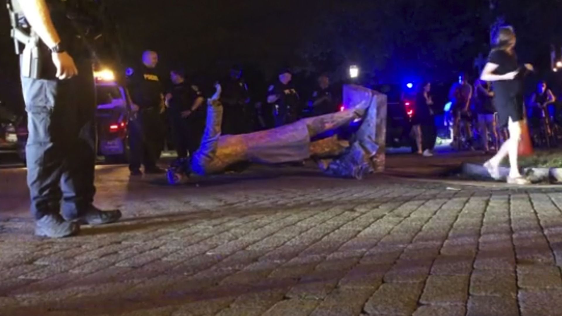 - Videos on social media showed the monument being towed away as a crowd cheered. (AP)