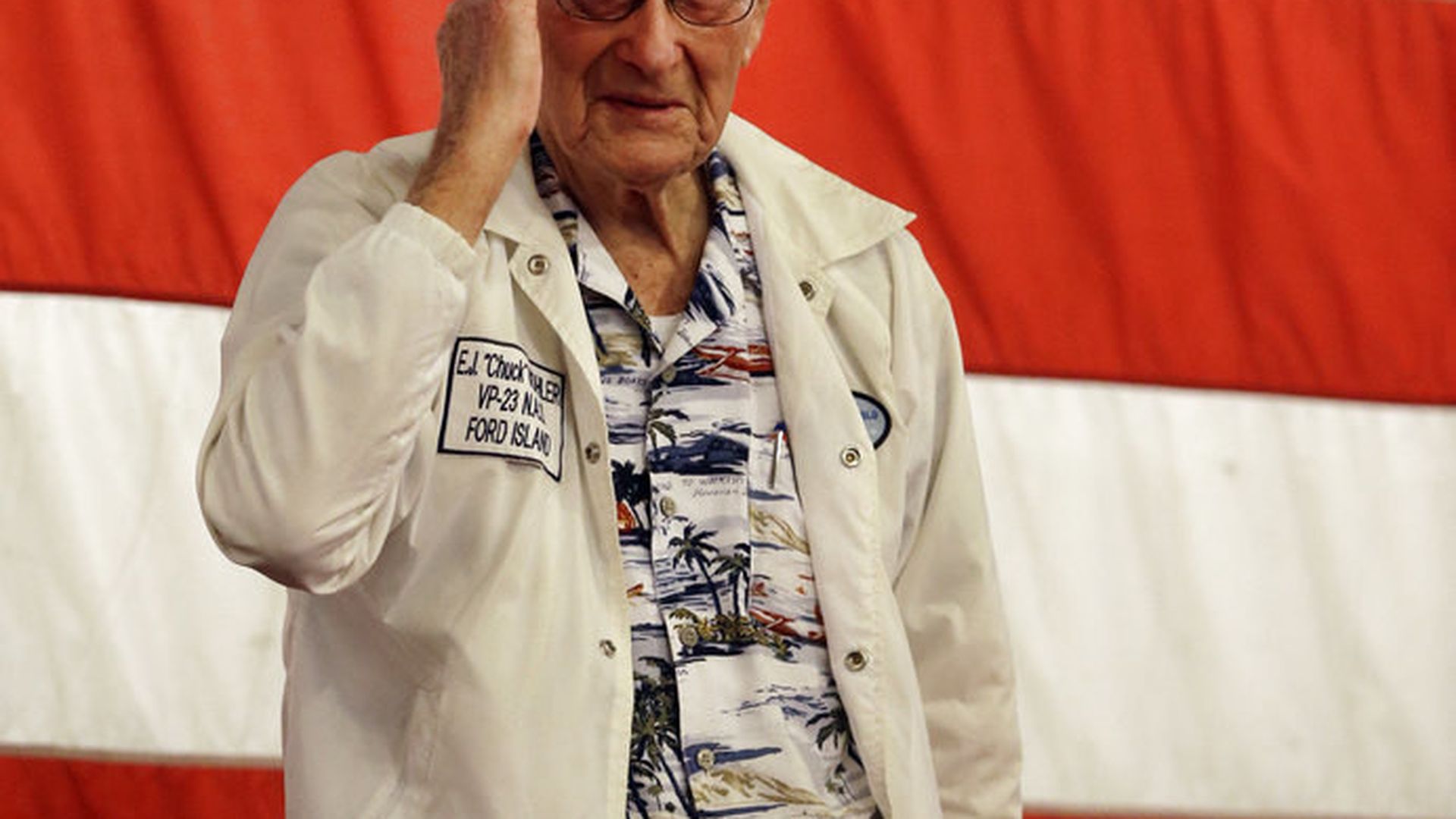 Pearl Harbor survivor Chuck Kohler, 94, salutes the audience after giving remarks during a remembrance ceremony aboard the USS Hornet yesterday in Alameda, Calif.