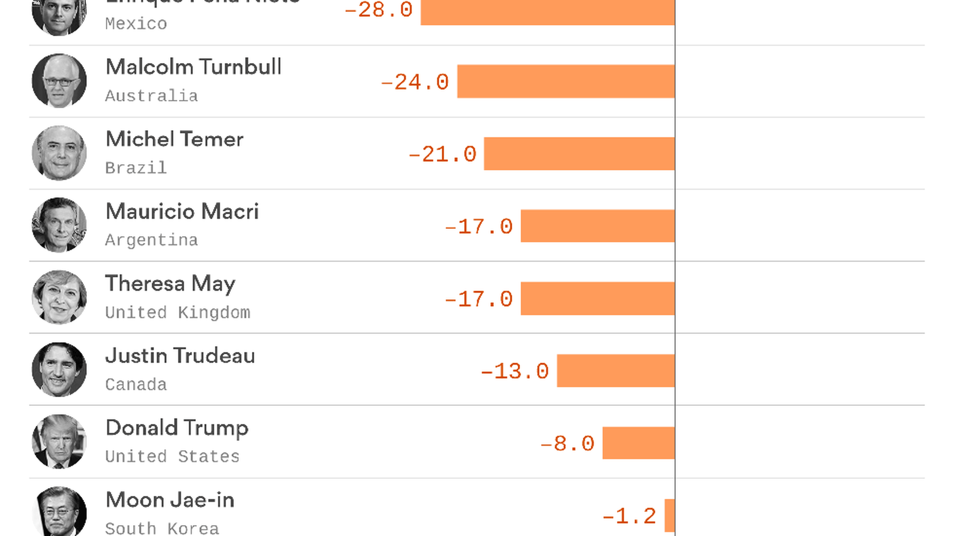 From the Eurasia Group's Leon Levy, here's a list of world leaders who have had the some of the biggest swings in sentiment from the start of their current terms until now.