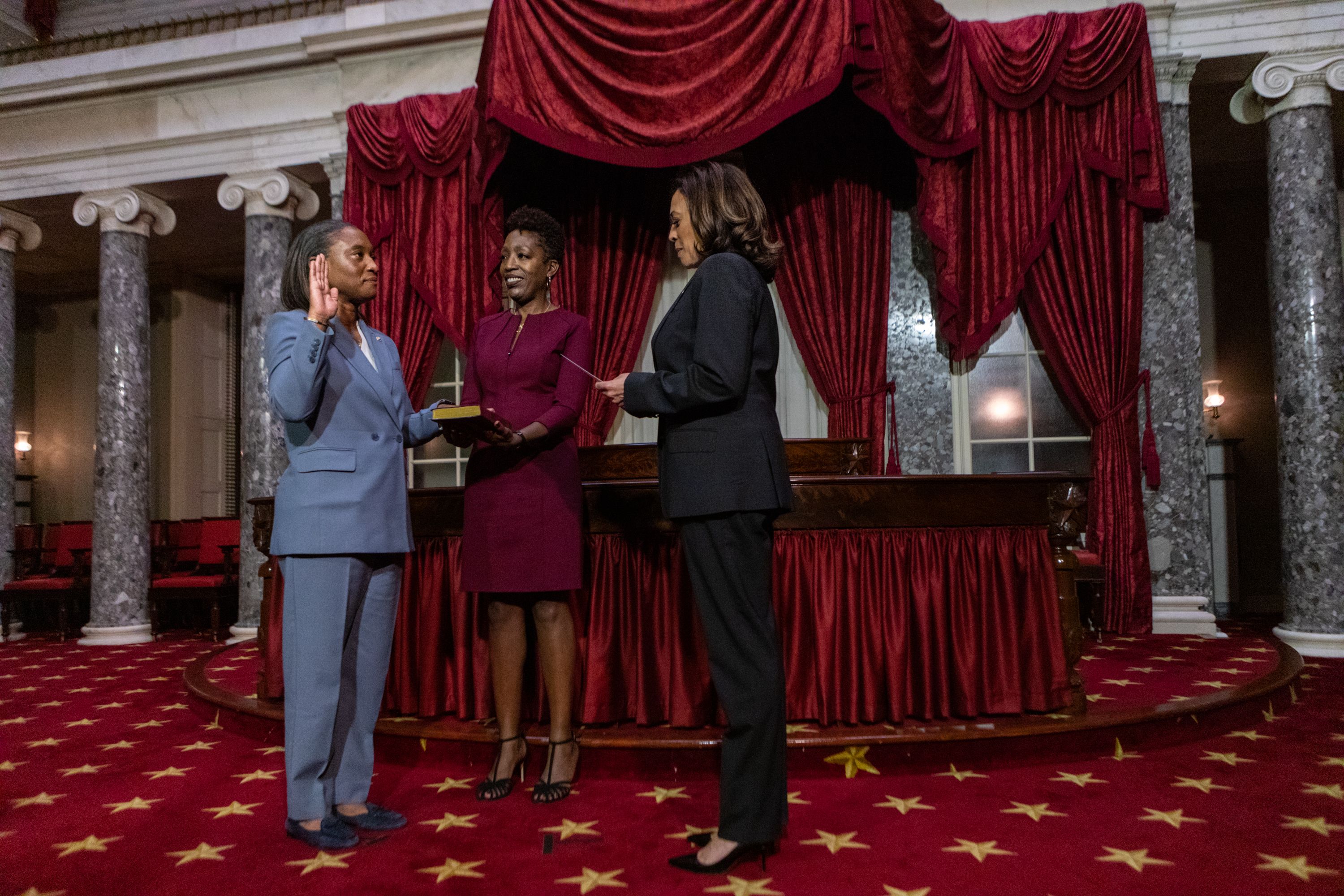 Sen. Laphonza Butler (D-Calif.), appointed to fill the seat of the late Sen. Dianne Feinstein, was sworn in by Vice President Harris yesterday in the Old Senate Chamber at the U.S. Capitol.