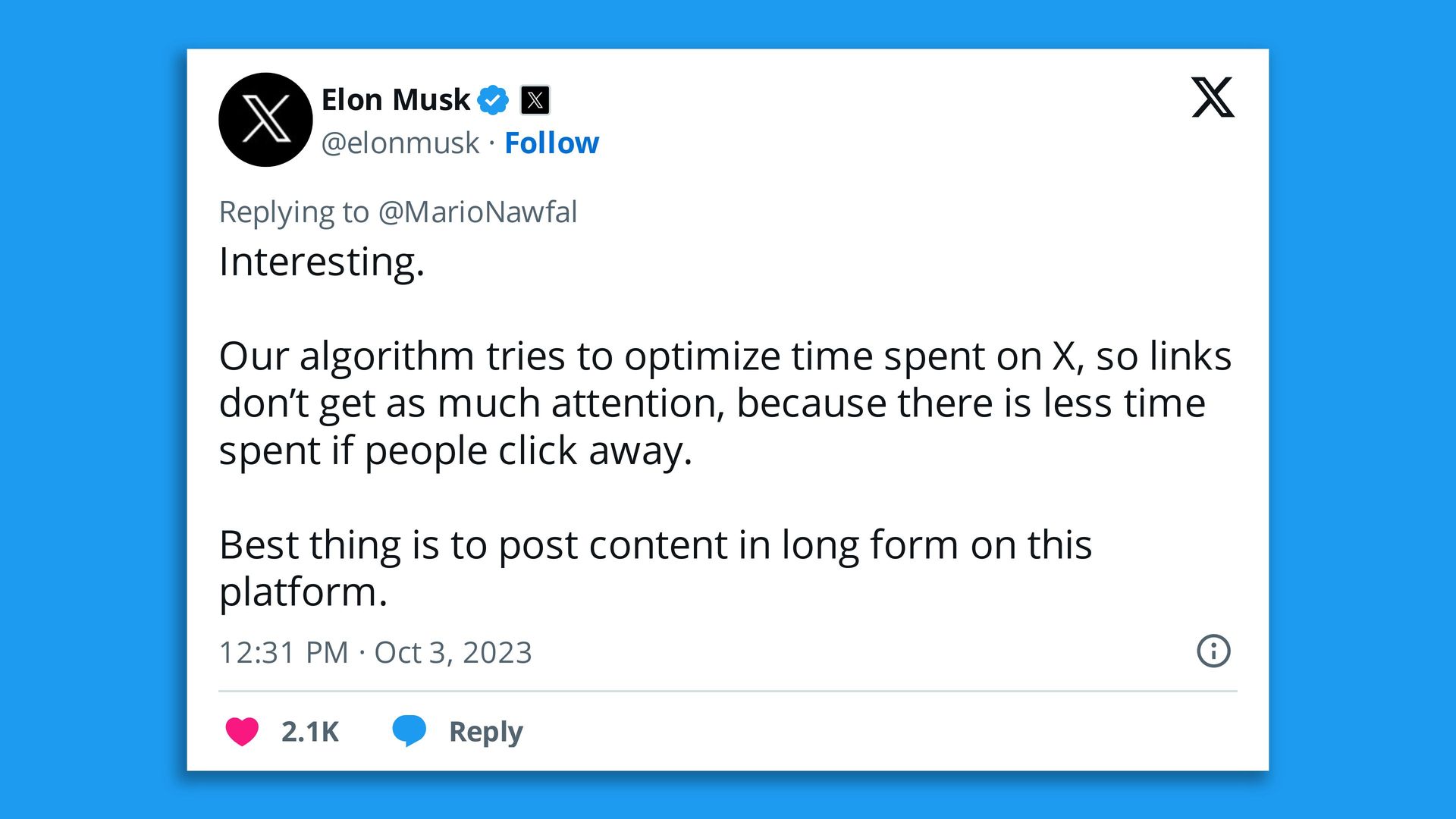 Elon Musk told users of X, formerly Twitter, that the "best thing to do" in order to get engagement on his platform is to post long-form content, as "links don't get as much attention," Axios' Sara Fischer writes.