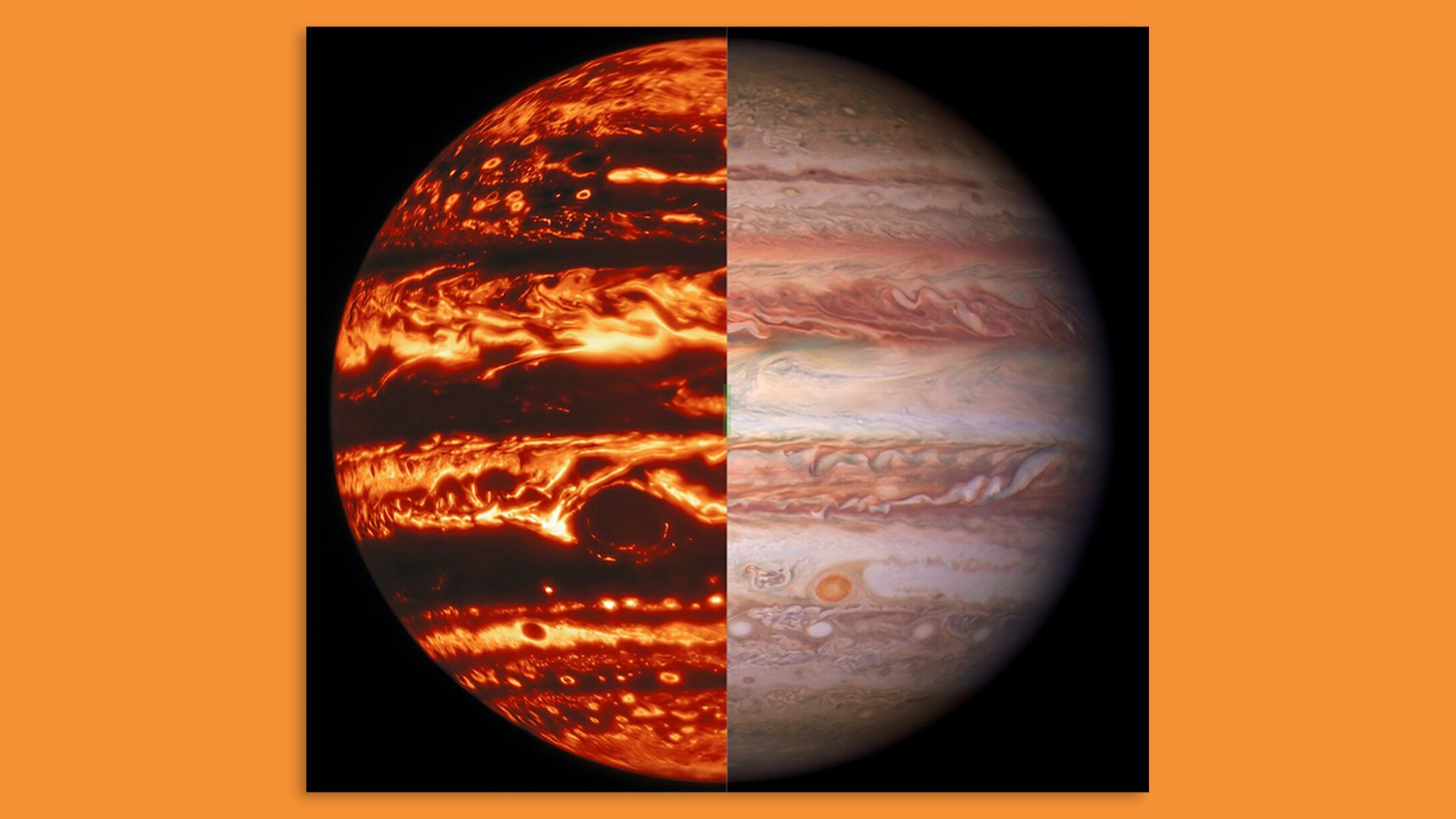 This combined image from NASA shows Jupiter as seen by the Juno orbiting spacecraft's microwave radiometer (left) and in visible light, captured by the Gemini Observatory.