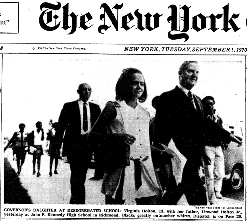 Virginia's Gov. Linwood Holton Jr. personally accompanied his thirteen‐year‐old daughter to the hitherto all‐[B]lack John F. Kennedy High School in Richmond; Gregory Thomas, commanding officer of the, school's corps of cadets, taking apprehensive white students in tow, told them: "This is now your school, too."