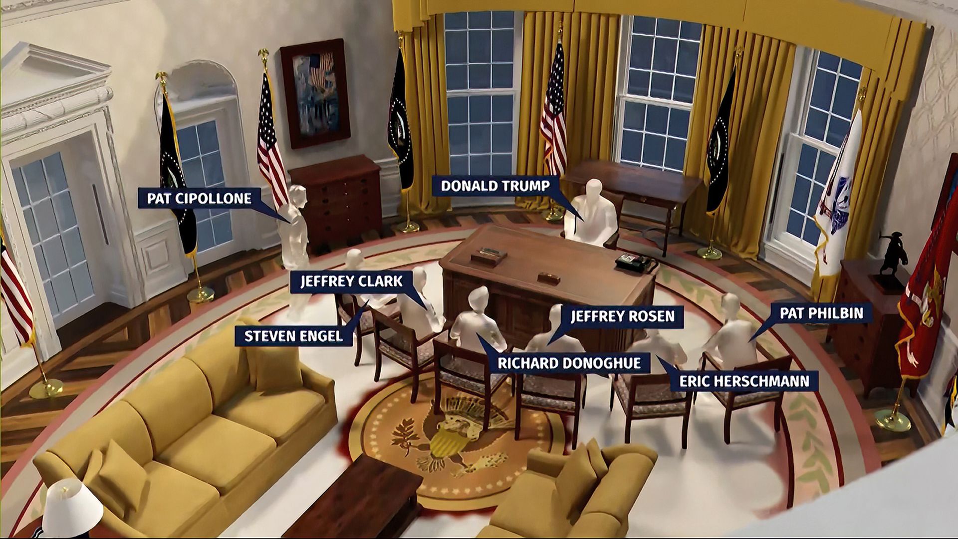 - The committee brought in former ABC News president James Goldston, who has been producing each hearing as if it were a "20/20" episode — raw enough to be credible, but scripted enough to sell the story in the allotted time. Goldston has added network-style graphics — an animation of the Capitol breach, a seating chart for a bonkers Oval Office meeting, a West Wing map yesterday to show how close Cassidy Hutchinson sat to the Oval Office.