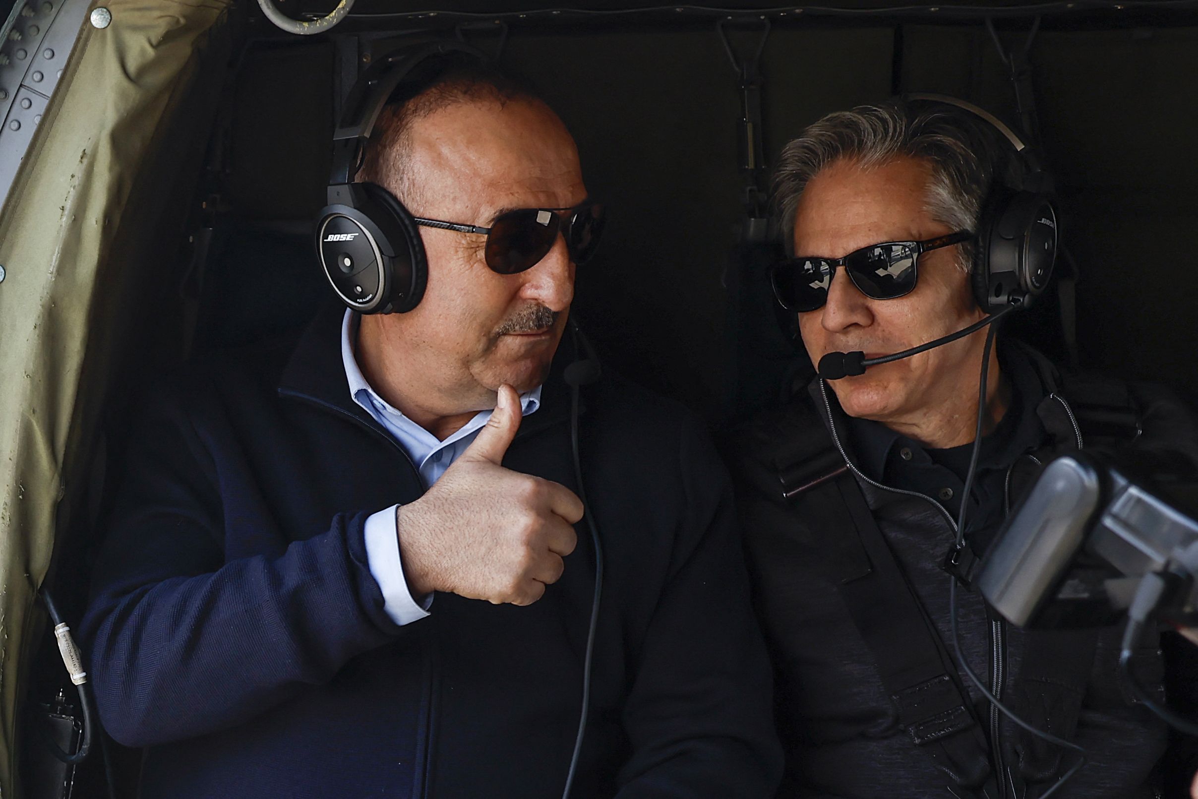 Secretary of State Tony Blinken (right) and Turkish Foreign Minister Mevlut Cavusoglu tour the earthquake zone yesterday.