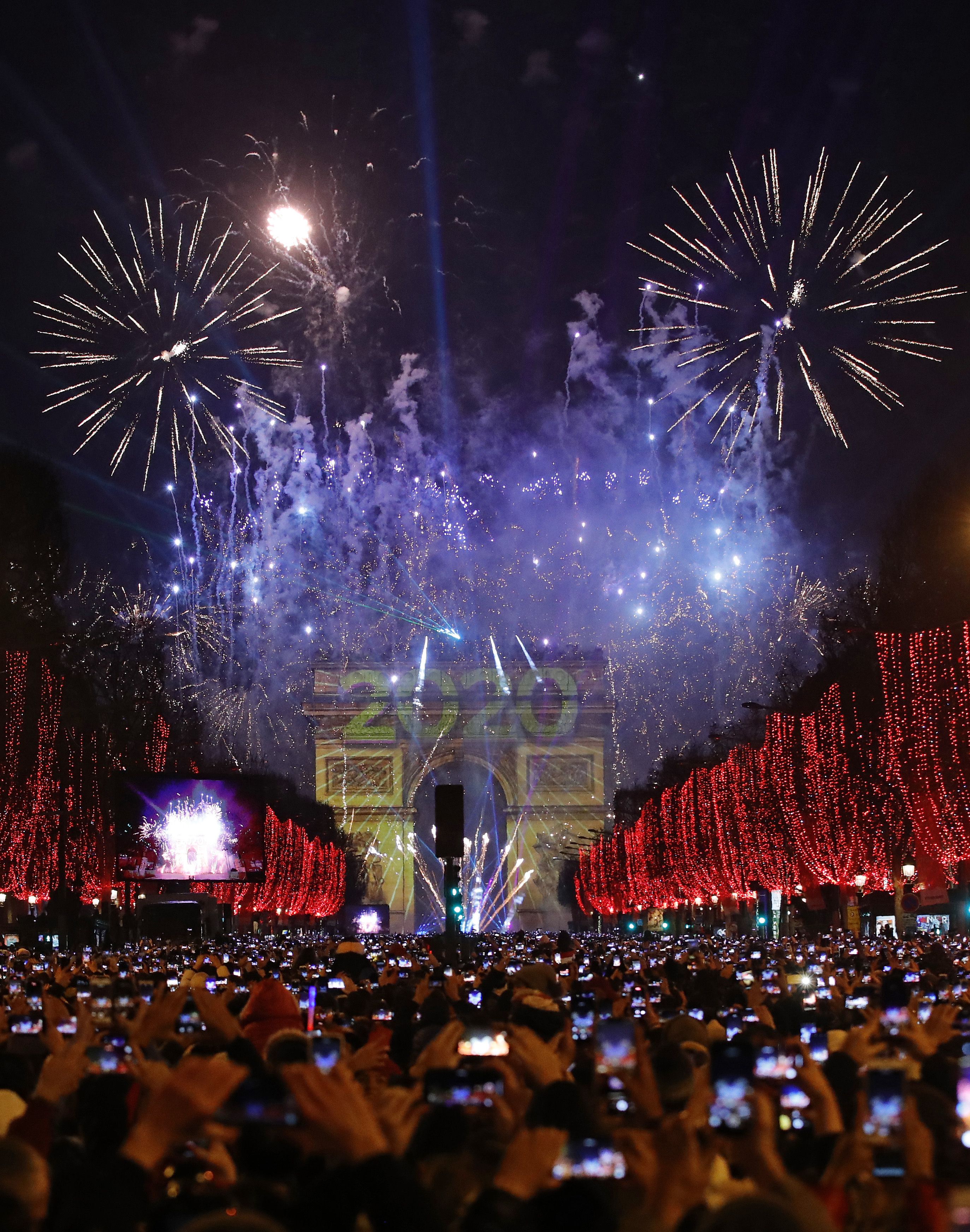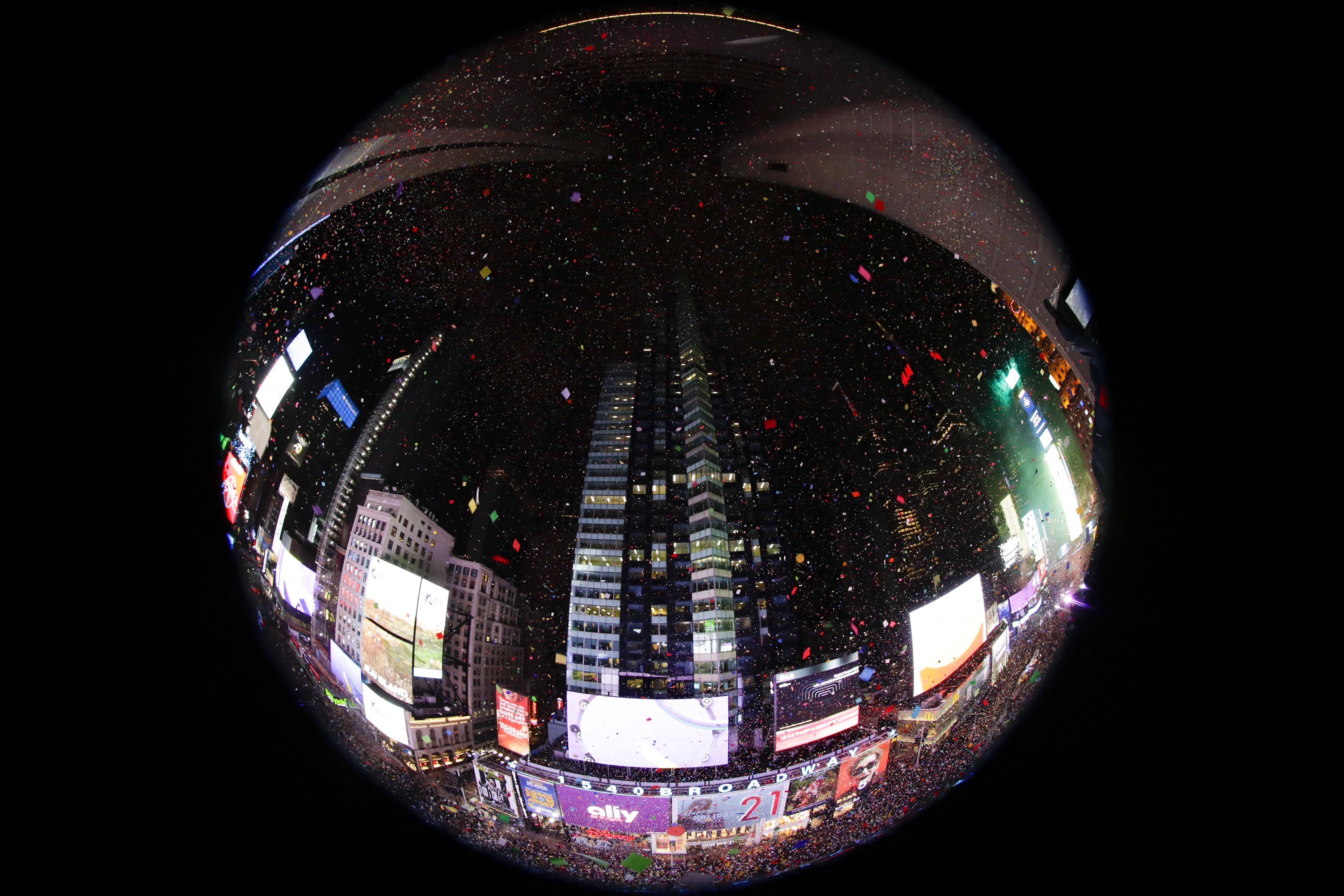 Above: A fisheye lens shows confetti dropping over Times Square at midnight.