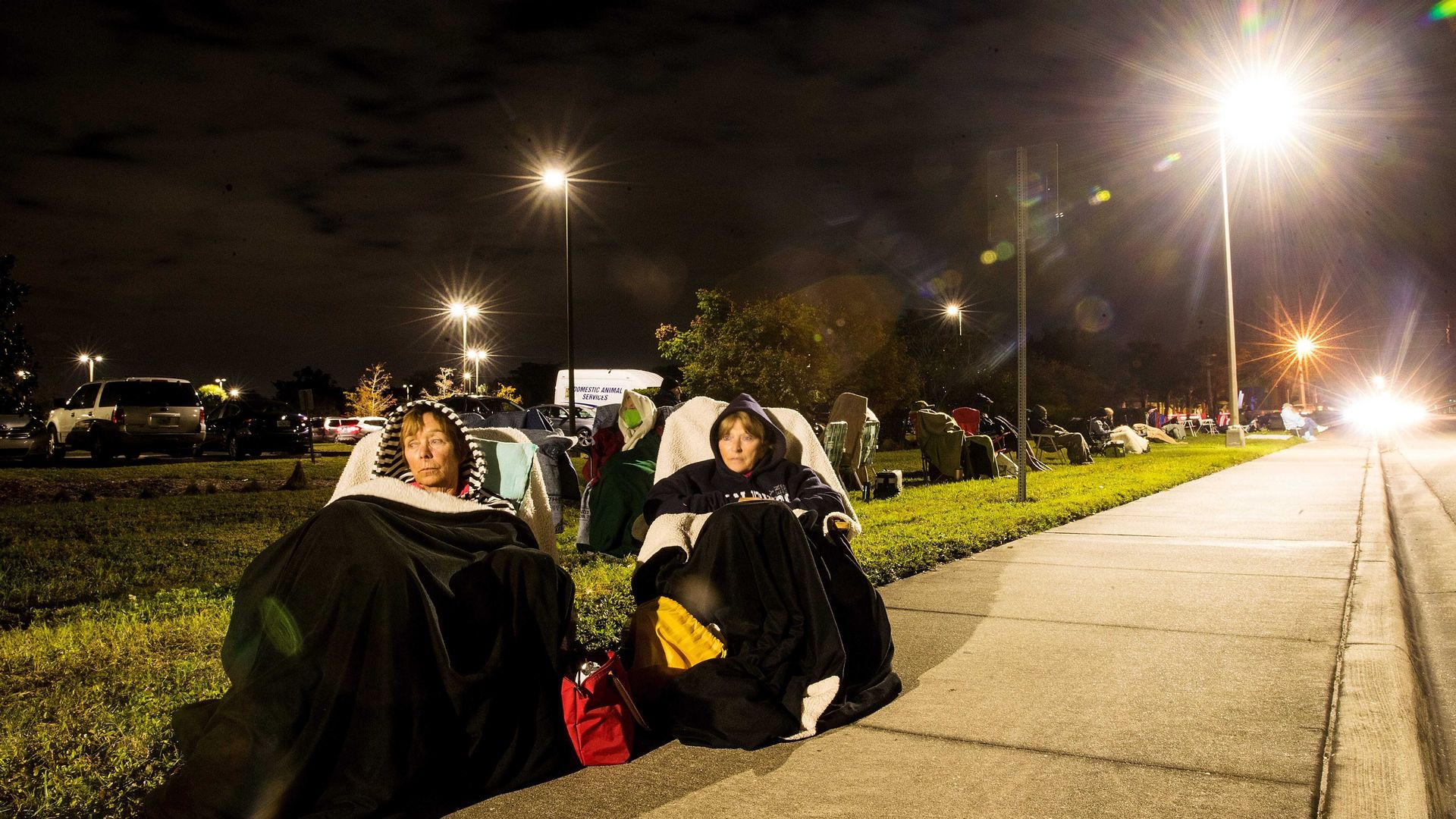 Friends Patty Tubbs, 68, Terri Kado, 66, got in line at midnight for a COVID vaccine at Lakes Park Regional Library in Fort Myers, Fla. Photo: Andrew West/The (Fort Myers) News-Press via Reuters