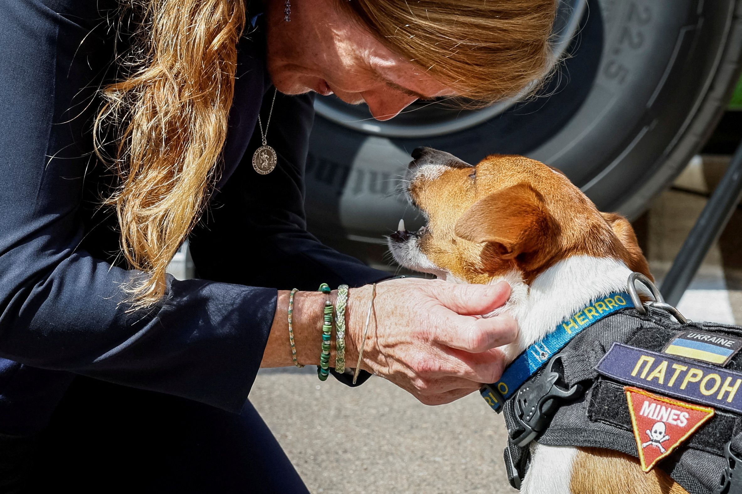 USAID Administrator Samantha Power plays with Patron — a famous Ukrainian bomb-sniffing Jack Russell Terrier — during a Kyiv visit yesterday.