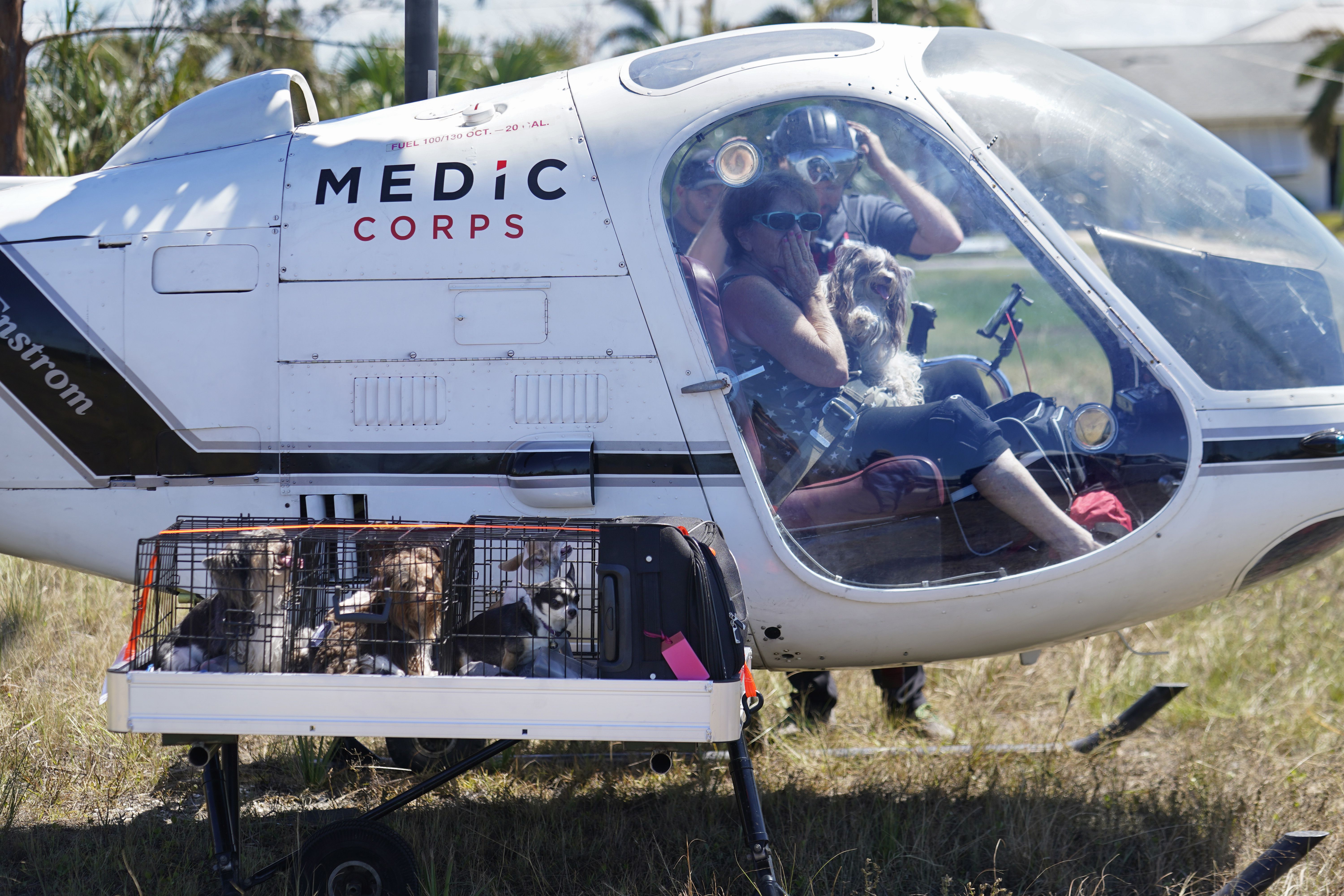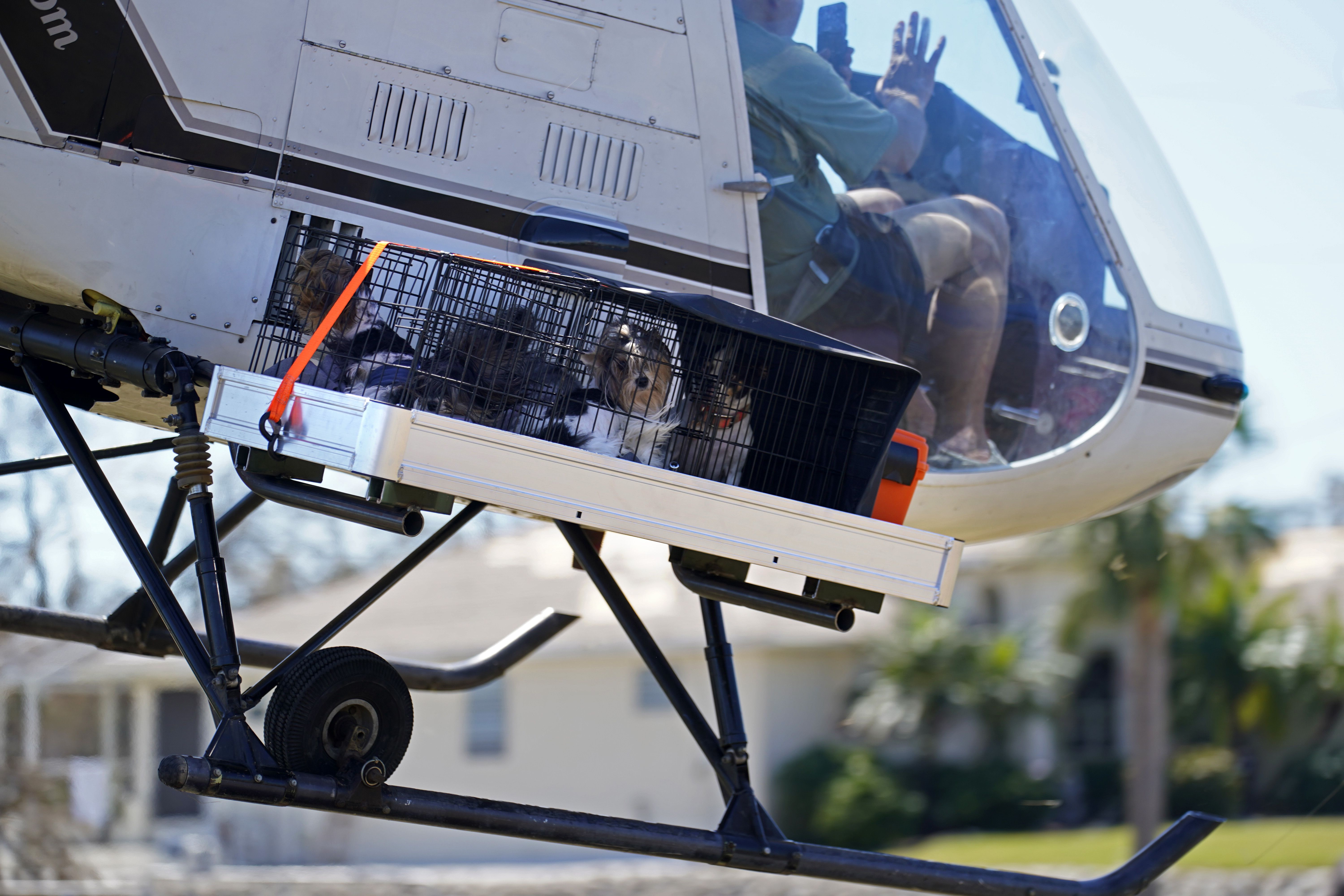 Dogs are strapped to an external cargo platform on a helicopter by Medic Corps, a nonprofit response group based in Springdale, Ark.