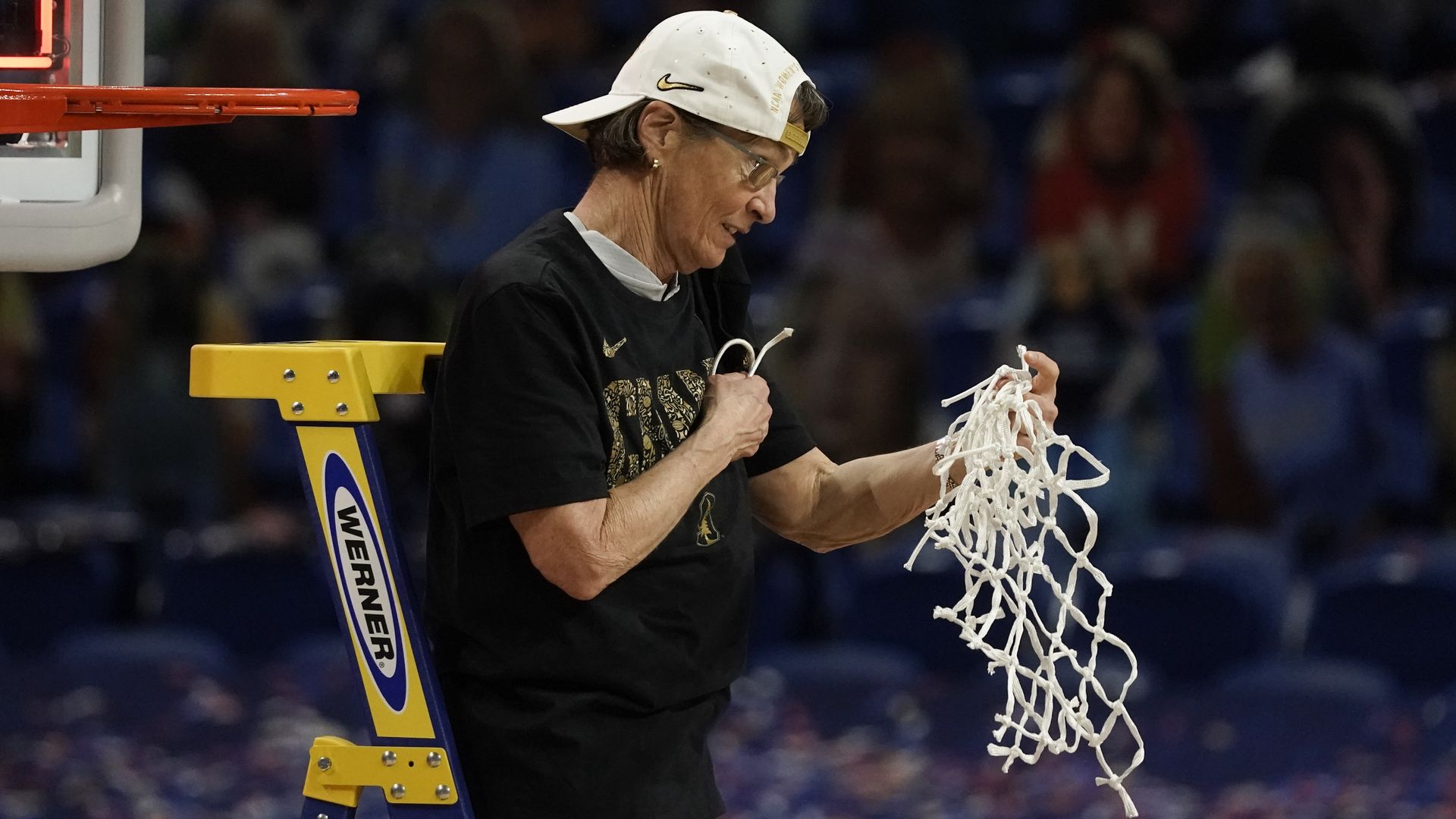 Above, Stanford coach Tara VanDerveer cuts down the net after the Cardinal beat Arizona, 54-53, in a women's national championship that came down to the final shot.