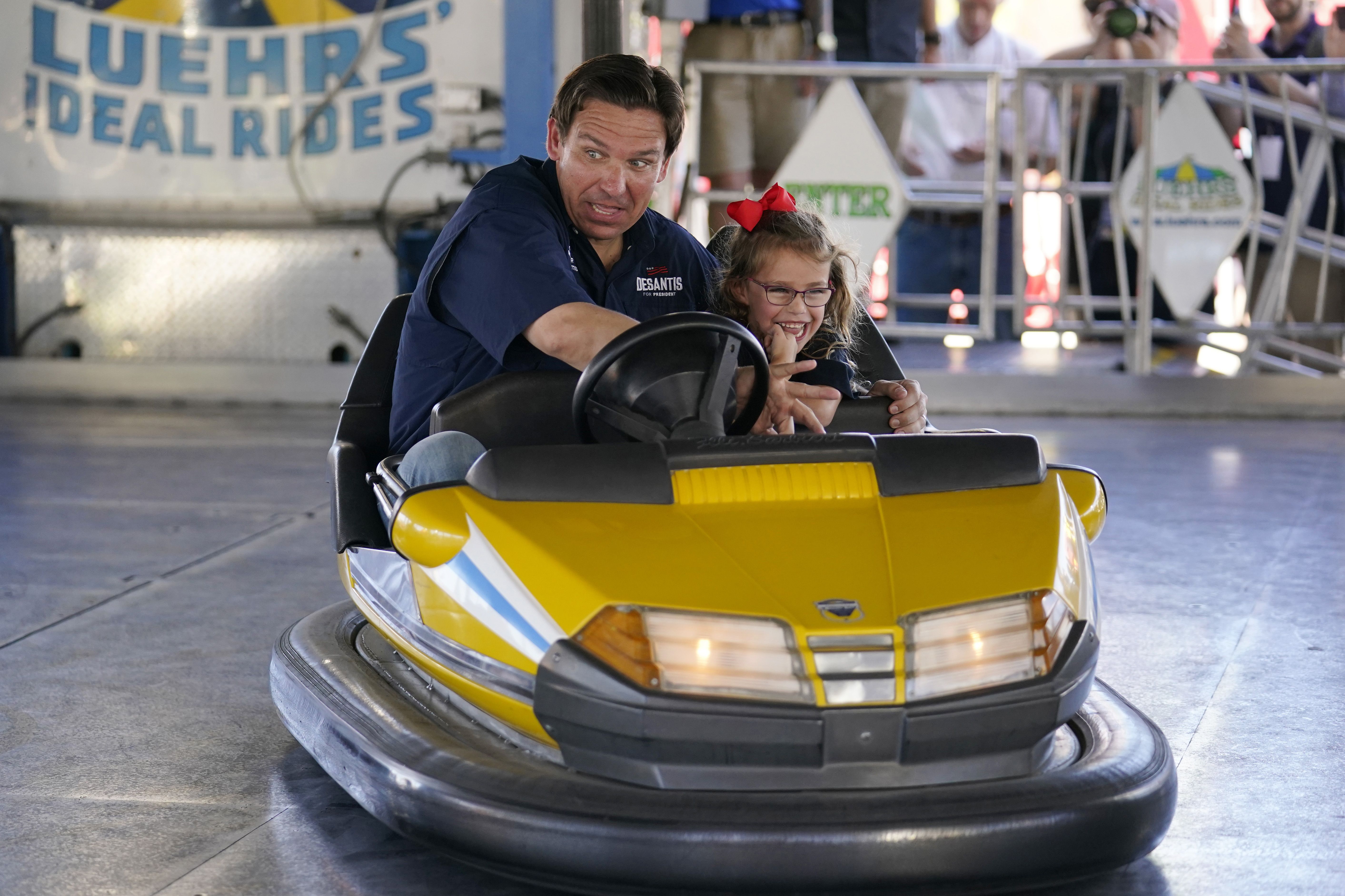 Florida Gov. Ron DeSantis β joining other Republican presidential candidates this weekend at the Iowa State Fair β drove a bumper car with his daughter Madison (above) and flipped pork chops (below).