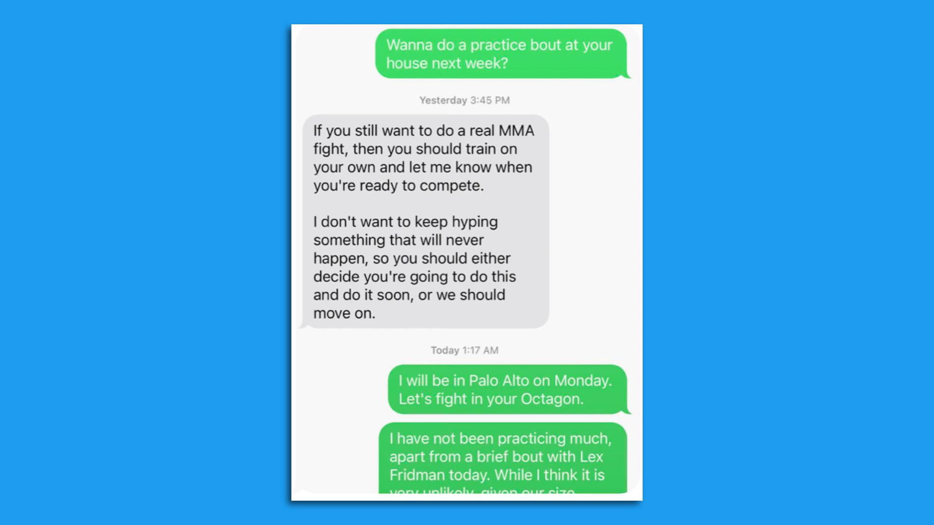 π₯ Isaacson posted a screenshot of a text exchange between Musk and Meta CEO Mark Zuckerberg, making it clear that the physical fight they've discussed won't happen any time soon.