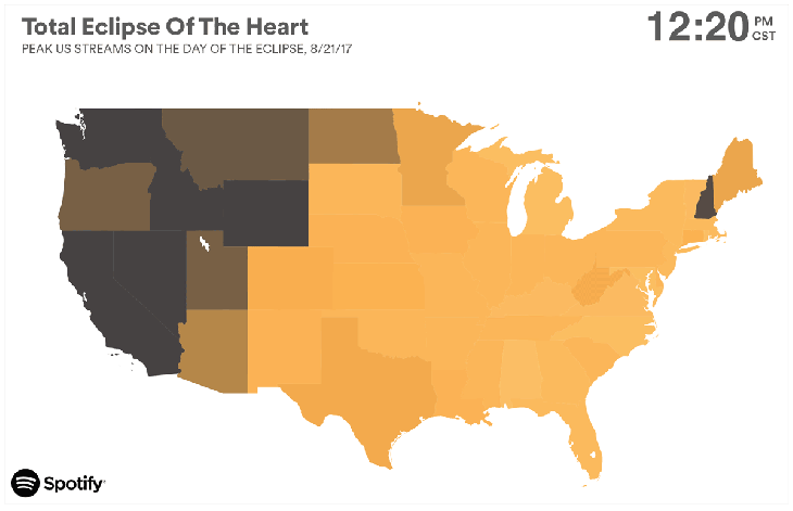 - Like a weather system, plays of Bonnie Tyler's "Total Eclipse of the Heart" swept across the nation during the eclipse, roughly following the path of totality.