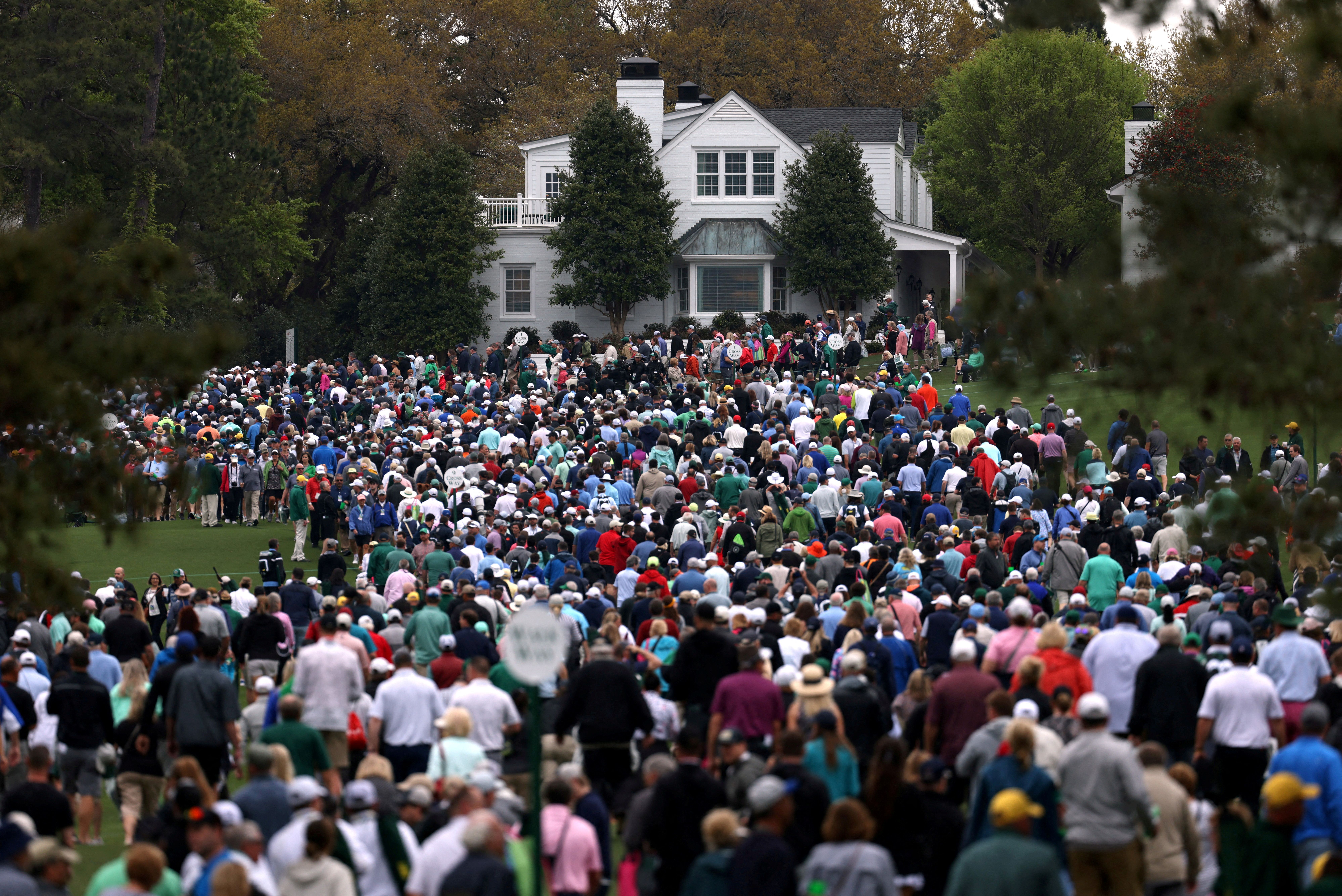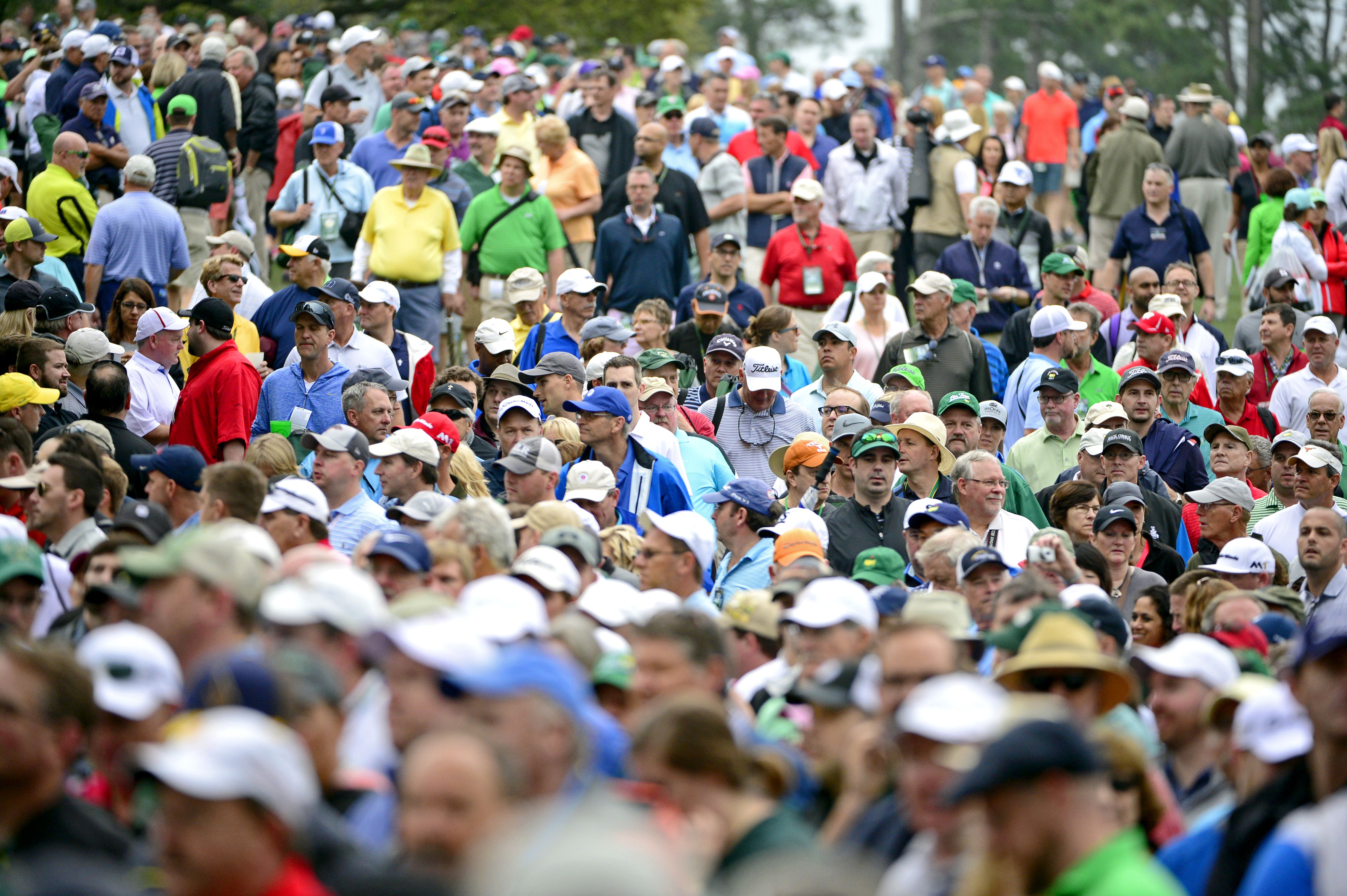 Patrons at Augusta National Golf Club in Georgia — who were watching practice rounds for The Masters, which begins tomorrow — evacuate after play was suspended due to a weather warning.