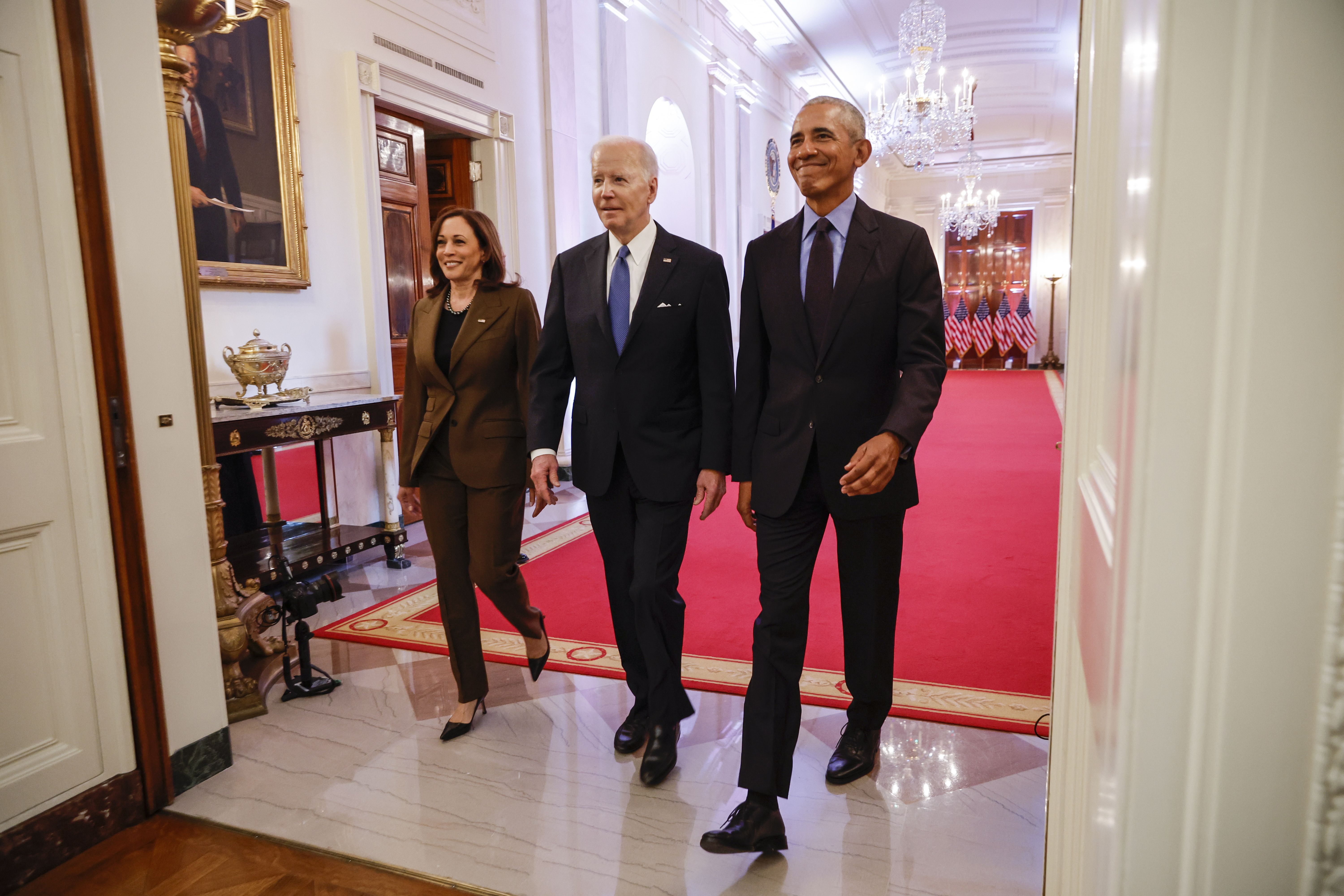 Vice President Harris, President Biden and former President Obama arrive yesterday at an East Room event marking the 12th anniversary of passage of the Affordable Care Act.