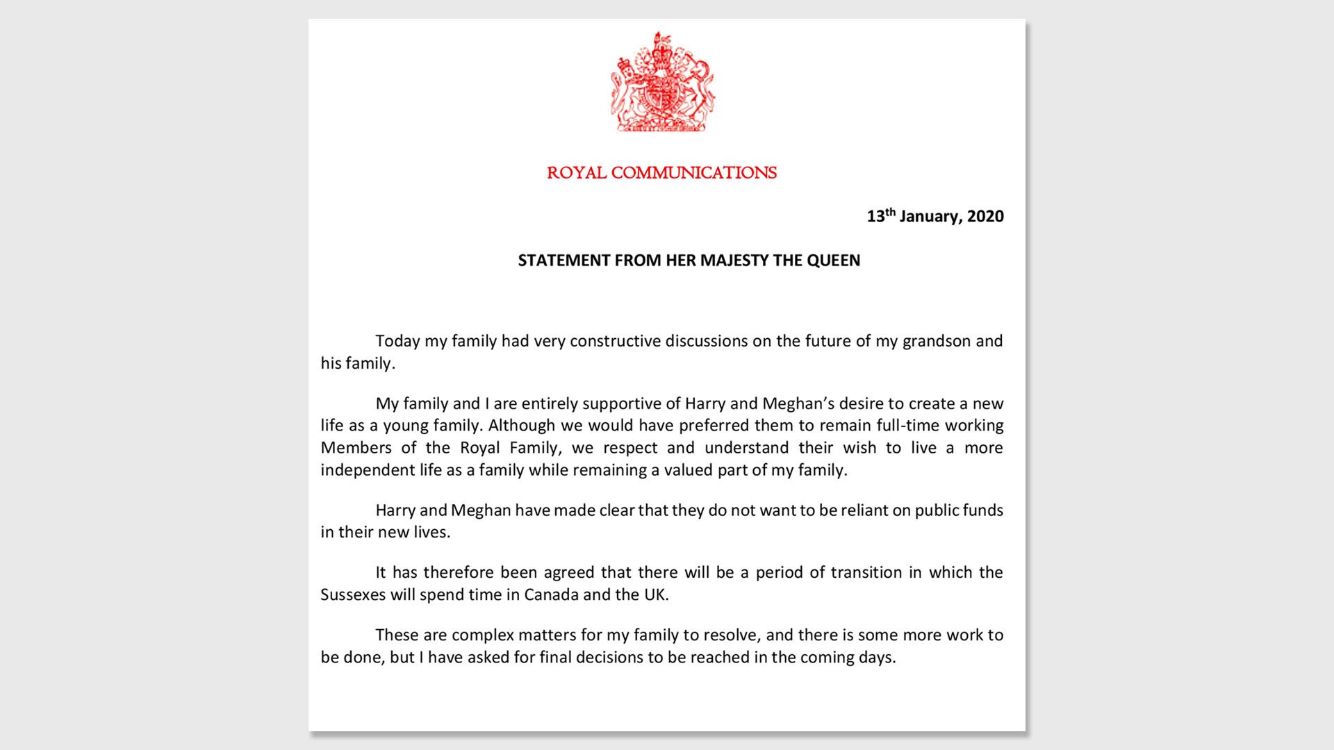 - Her statement "used the word 'family' eight times and the Queen appeared to be going out of her way to offer reassurance to the couple."