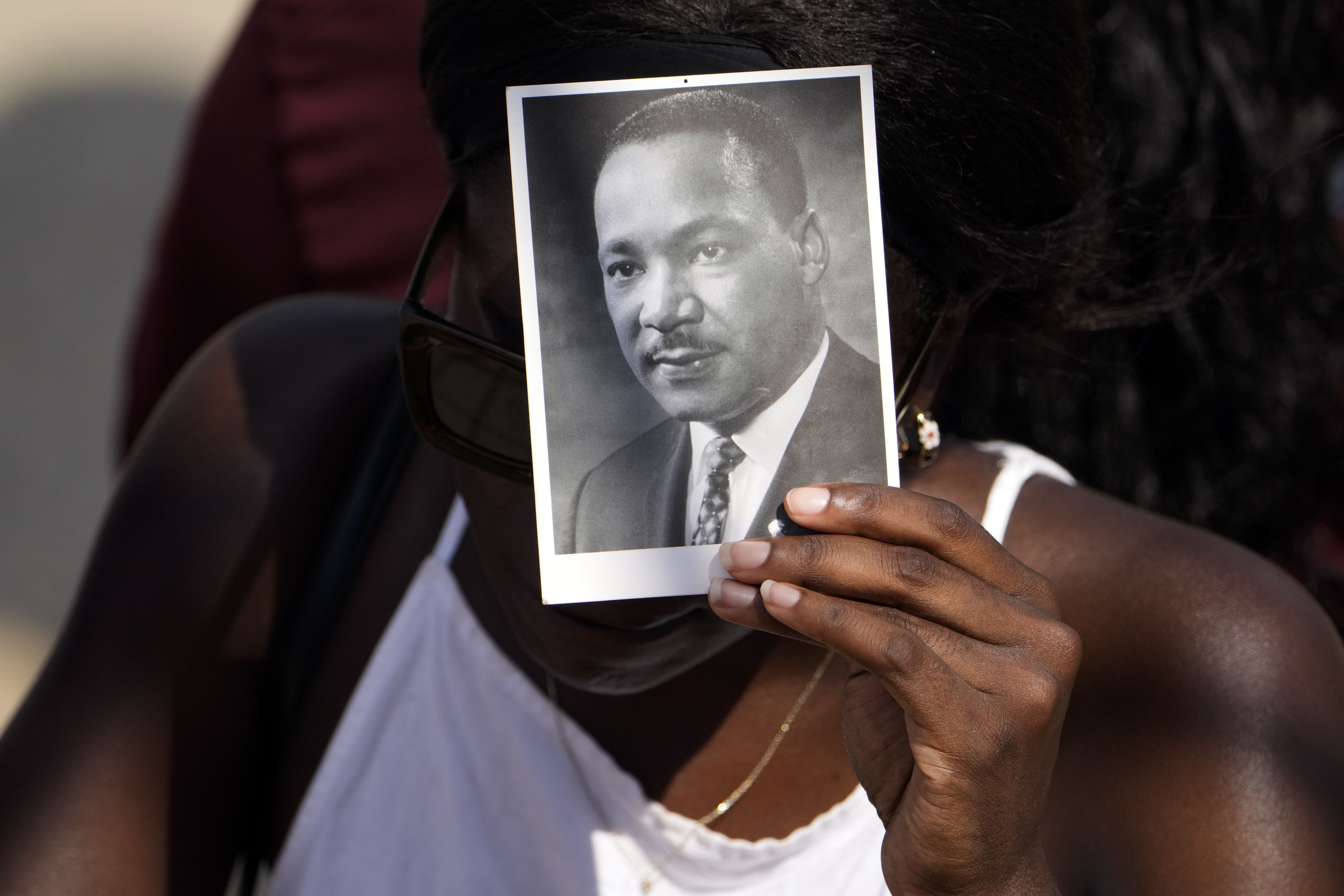Above: A person holds an image of the Rev. Martin Luther King Jr. as they listen to speakers during the 60th Anniversary of the March on Washington at the Lincoln Memorial in Washington D.C., yesterday.