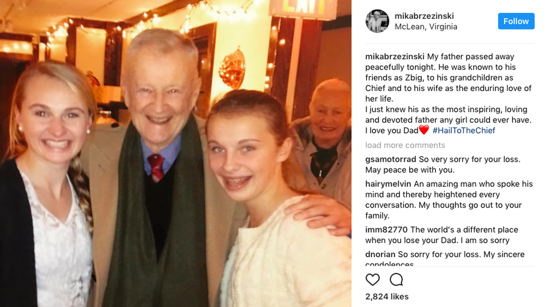 Mika Brzezinski announced on Instagram: "My father passed away peacefully tonight. He was known to his friends as Zbig, to his grandchildren as Chief and to his wife as the enduring love of her life. I just knew his as the most inspiring, loving and devoted father any girl could ever have. I love you Dad❤️ #HailToTheChief."