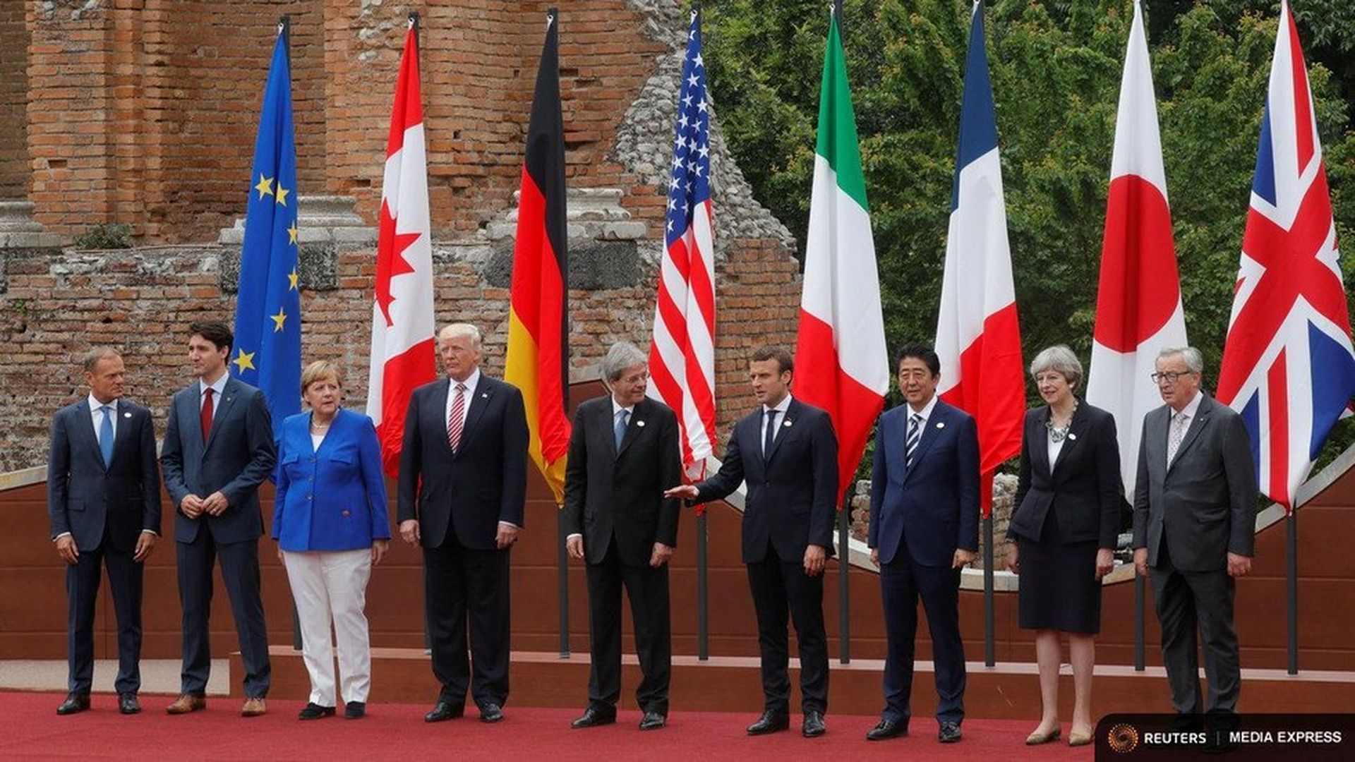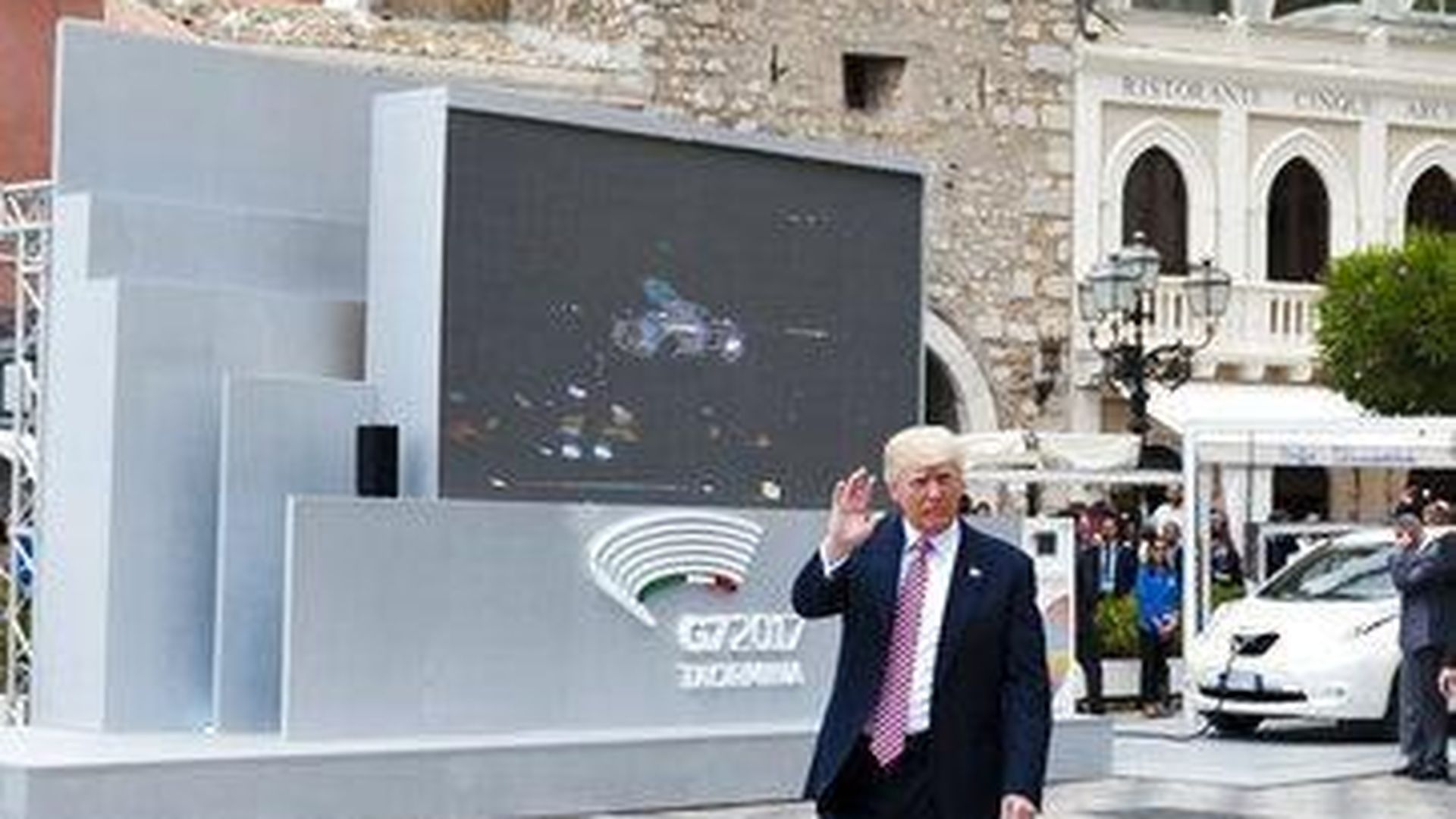 - "Trump's image as an outsider continued in Italy on Friday at the G-7 meeting in Taormina, Italy ... The presidents, chancellor and prime ministers of France, Germany, Italy, Japan, Canada and the United Kingdom walked the streets of Taormina. Trump followed in a golf cart."