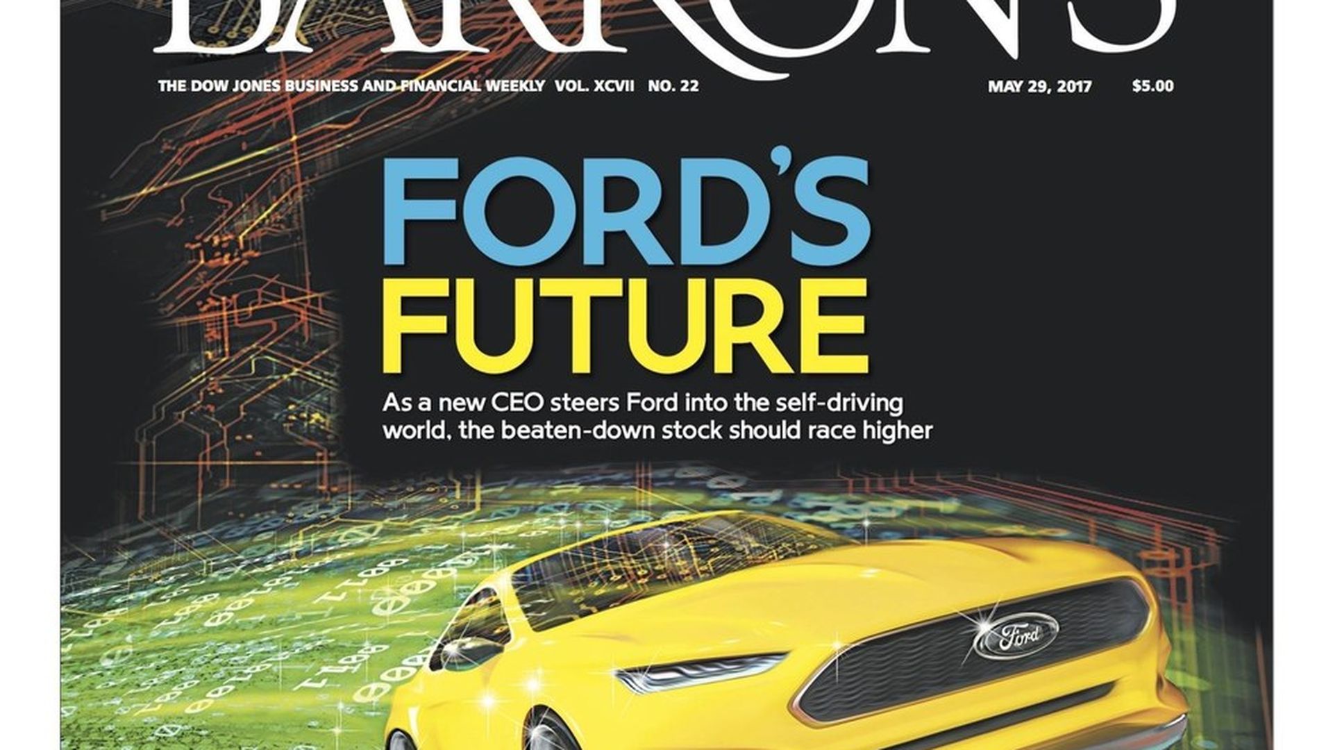 Barron's cover story, "Ford Races Toward an Exciting Future: New CEO Jim Hackett looks like an inspired choice to rev up Ford's self-driving car efforts and lift its stock," by Jack Hough (free link for Axios AM readers):