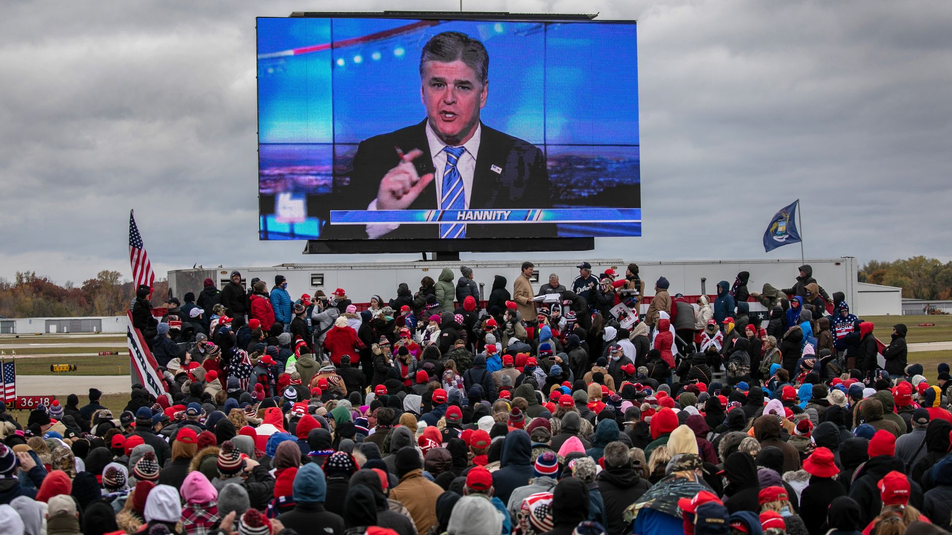 President Trump's pre-election rallies often featured Fox News clips — including this from Sean Hannity, played in Waterford, Mich., on Oct. 30. Photo: John Moore/Getty Images