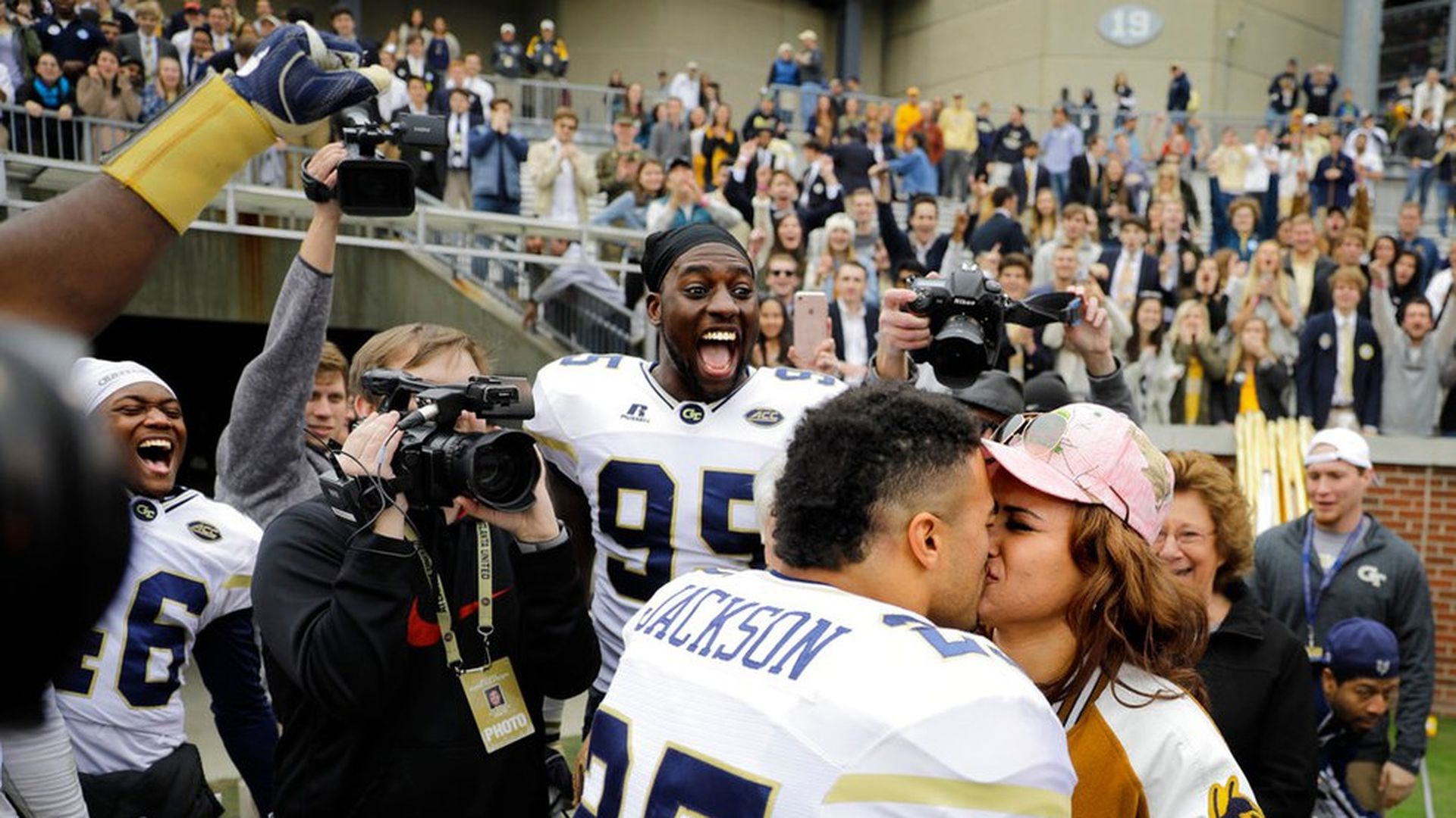 - "In the midst of the on-field celebration following Georgia Tech's 28-22 upset win over No. 17 Virginia Tech, Yellow Jackets linebacker Tre' Jackson proposed to girlfriend Desi Nathe. His teammates chanted 'Yes! Yes! Yes!' as he slipped the ring on."