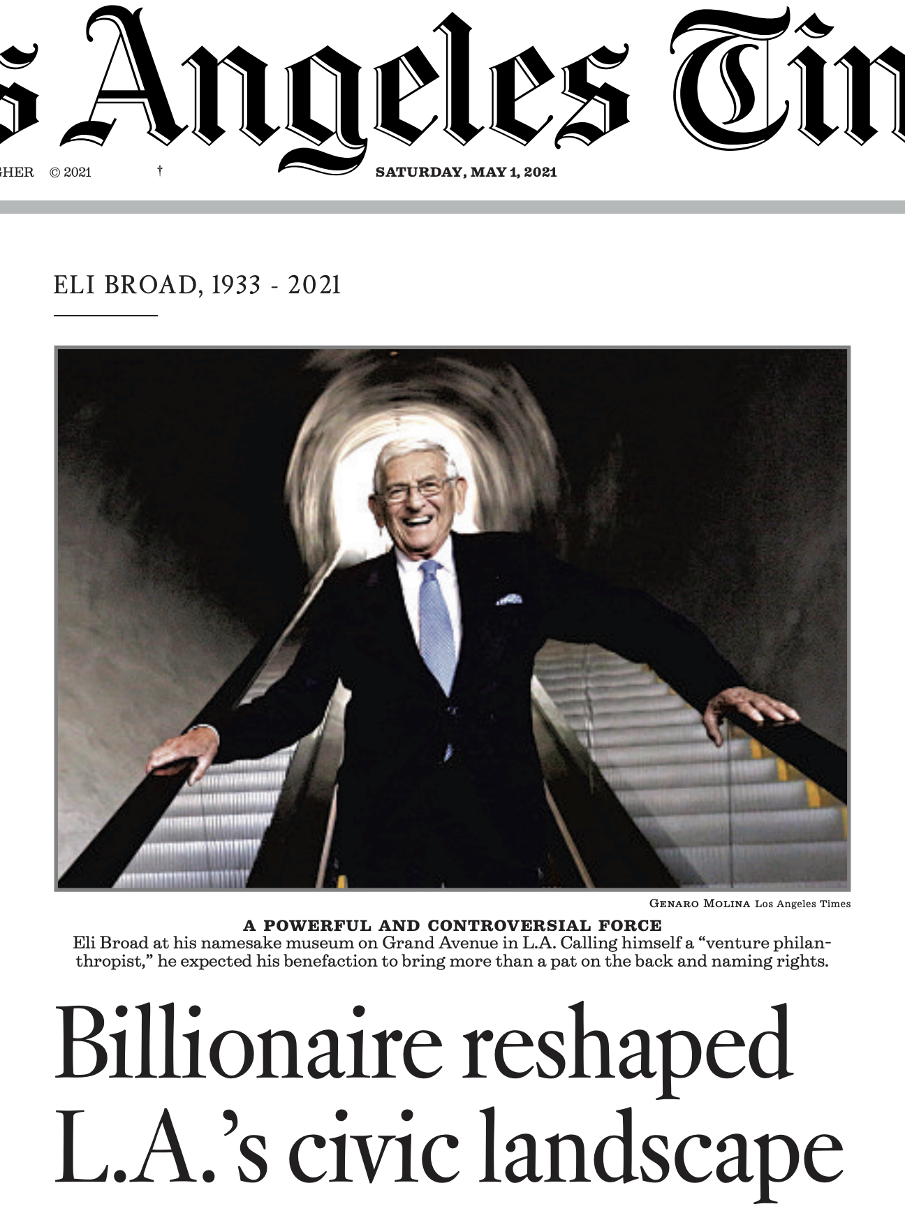 "Eli Broad made his billions building homes, and then he used that wealth — and the considerable collection of world-class modern art he assembled with his wife — to shape the city around him," the L.A. Times' Elaine Woo writes.