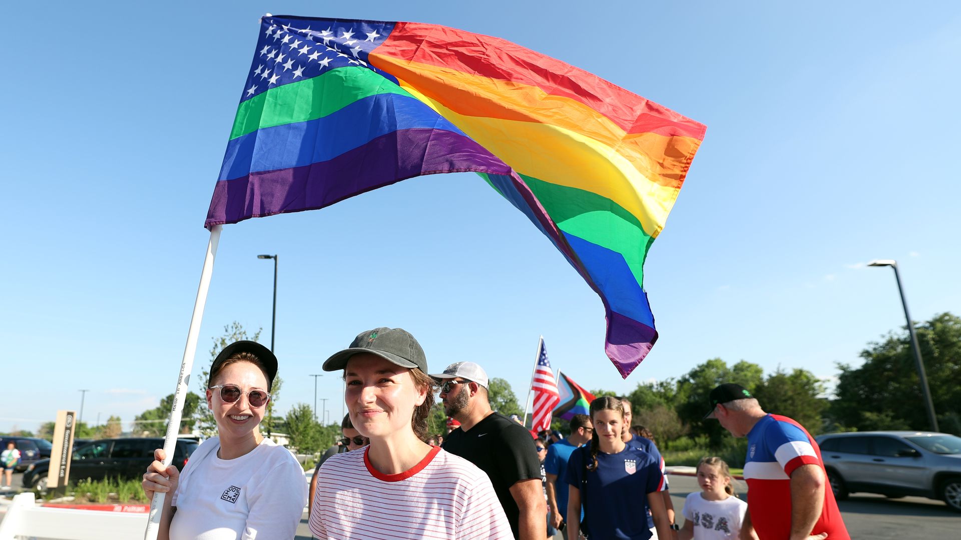 Fans wave a Pride flag as they arrive prior to the Summer Series game between the United States and Nigeria at Q2 Stadium. Photo: Omar Vega/Getty Images