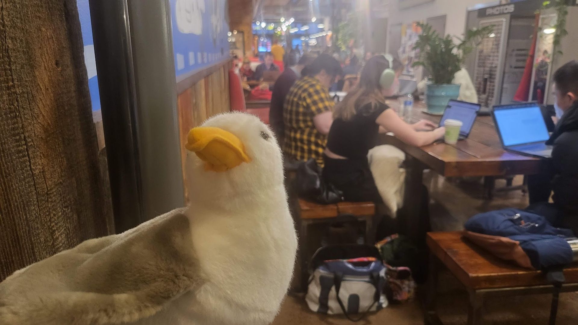 Townie, the Axios Boston mascot, couldn't take the winter rain any longer and flapped off to a local hangout. Can you guess where she was?