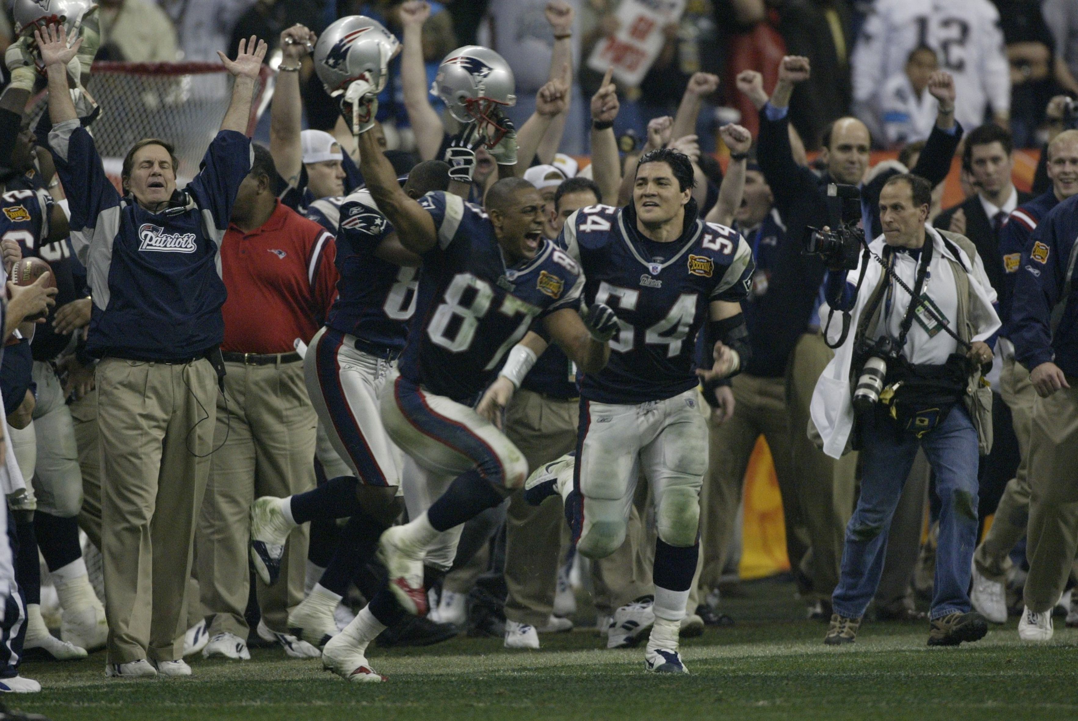 Belichick and QB Tom Brady celebrate their 20-17 victory over the "Greatest Show on Turf" Rams in Super Bowl 36, the first title in Patriots history and the beginning of their dynasty.
