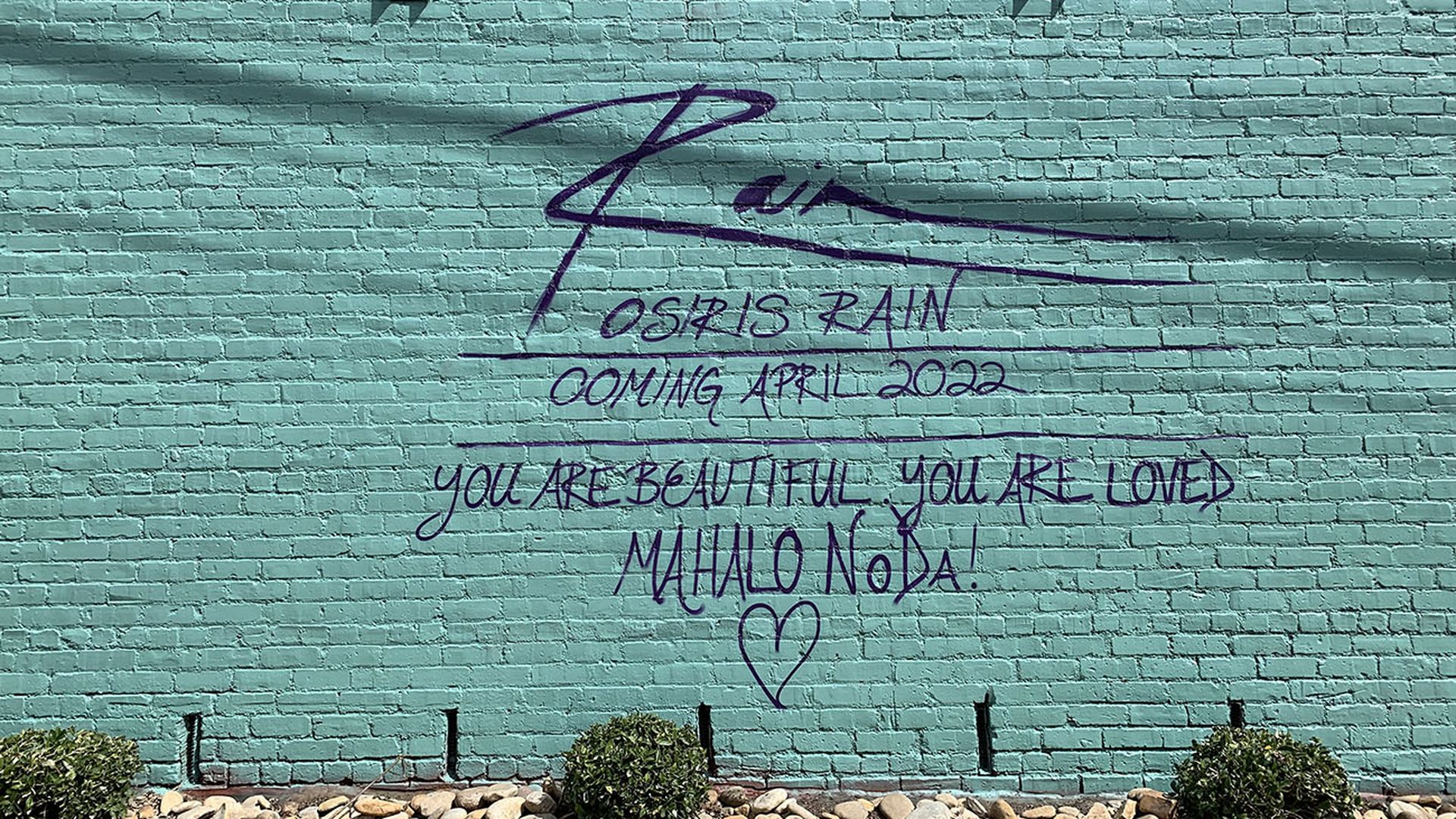 Over the weekend, Rain covered the "Bloom" wall again with a light turquoise color and a fresh message: "You are beautiful. You are loved. Mahalo NoDa!"