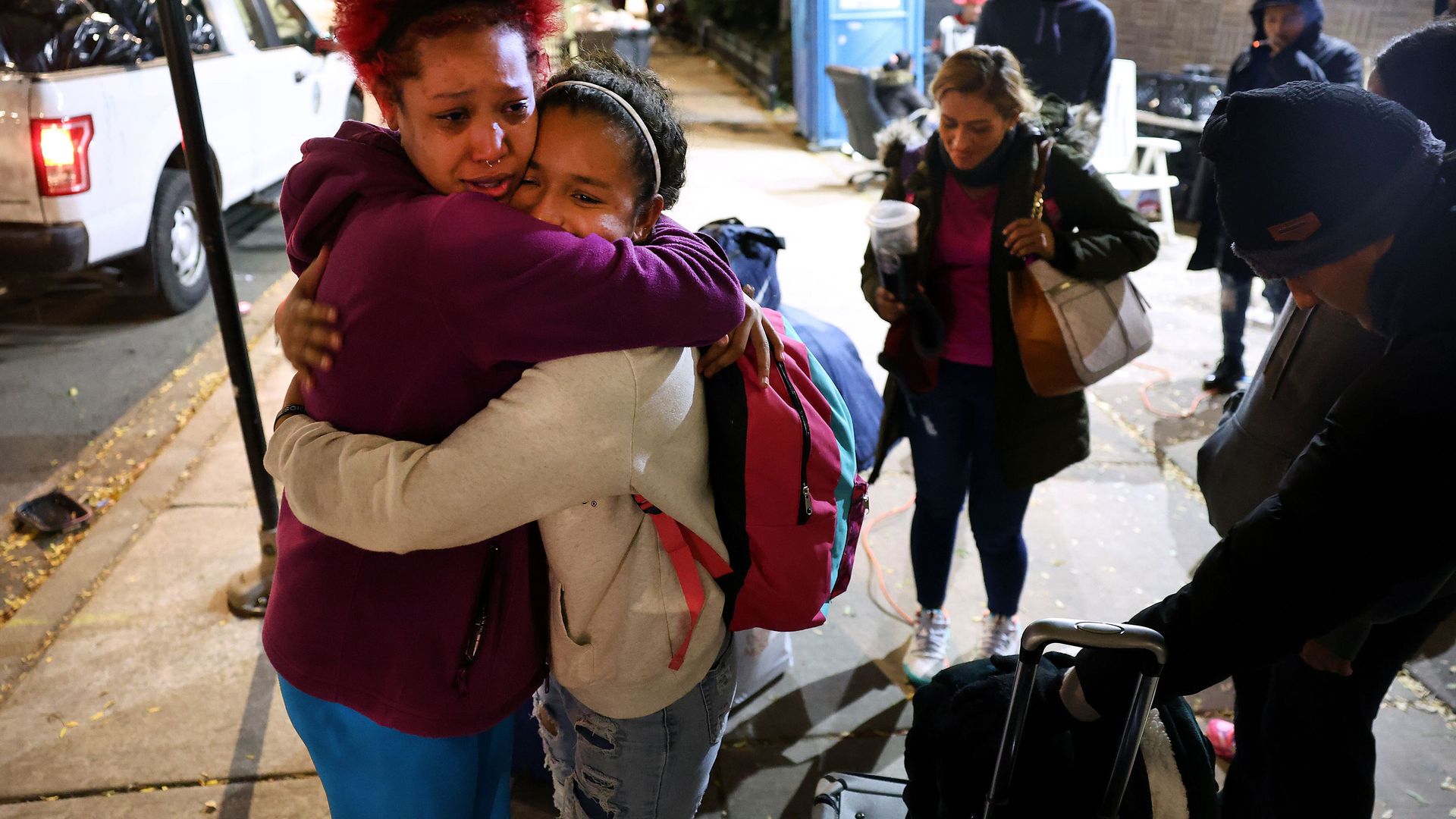 Yorbelis Molero, 16, says goodbye to a friend at a Chicago police station before she and her family leave by bus for Detroit in early November. Photo: Chris Sweda/Chicago Tribune via Getty Images