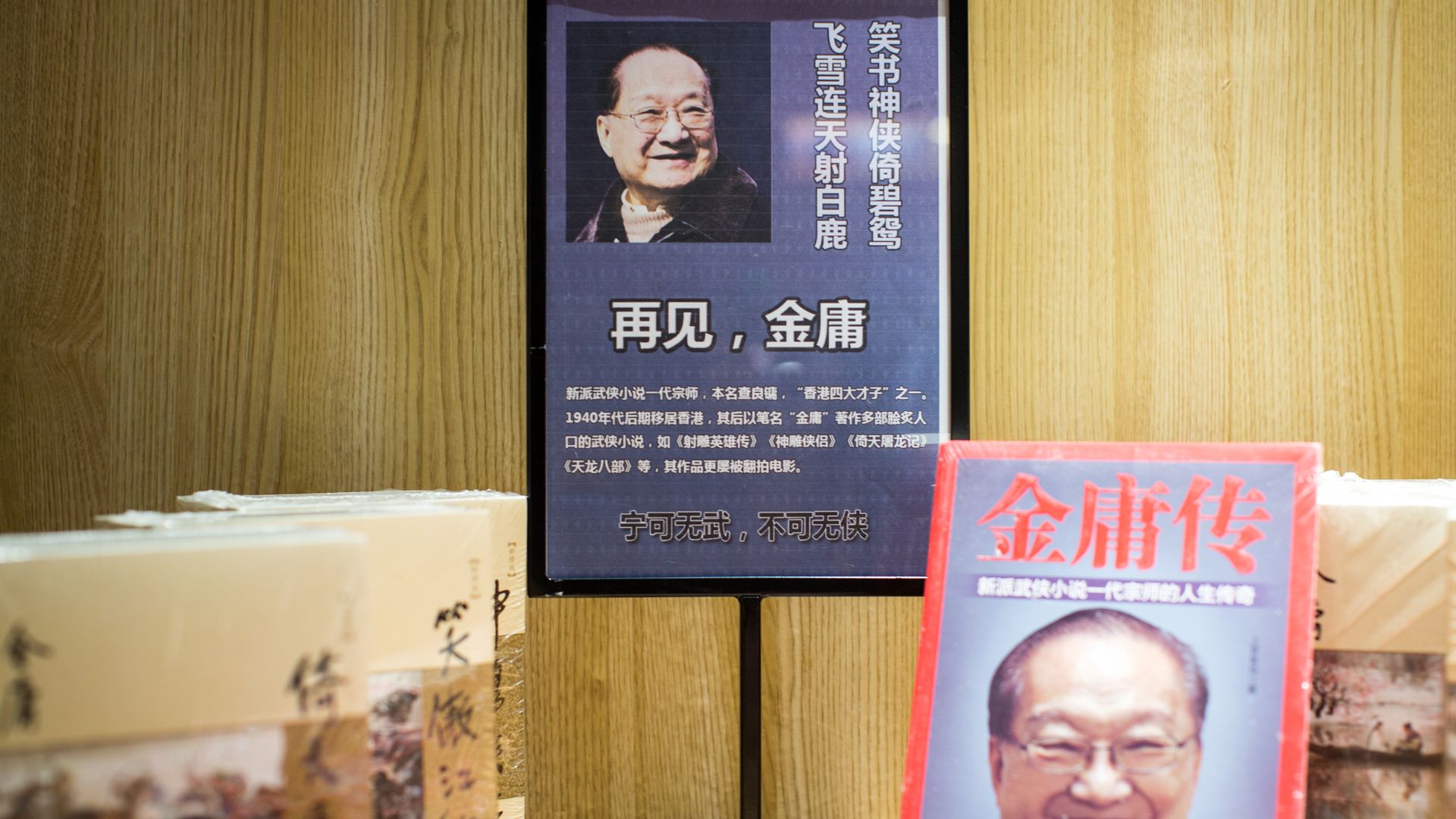 A picture of novelist Jin Yong (aka Louis Cha Jing-yong) is seen at a memorial section of a bookstore in Hangzhou, Zhejiang Province of China. Photo: VCG/VCG via Getty Images