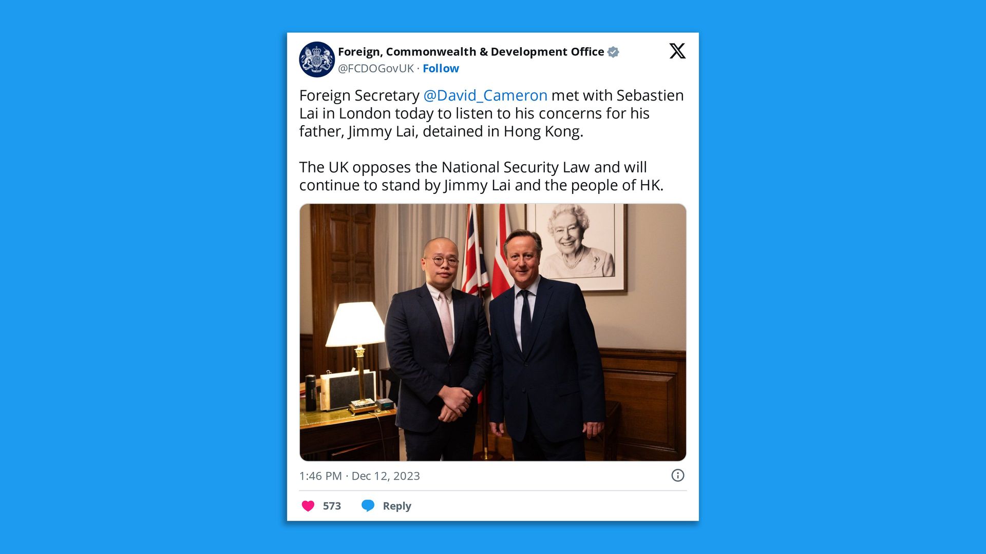 On Dec. 12, the U.K.'s new foreign secretary and former Prime Minister David Cameron met with Sebastien Lai, the son of Hong Kong media tycoon Jimmy Lai, who is now in prison in Hong Kong awaiting trial on national security charges due to his pro-democracy advocacy.