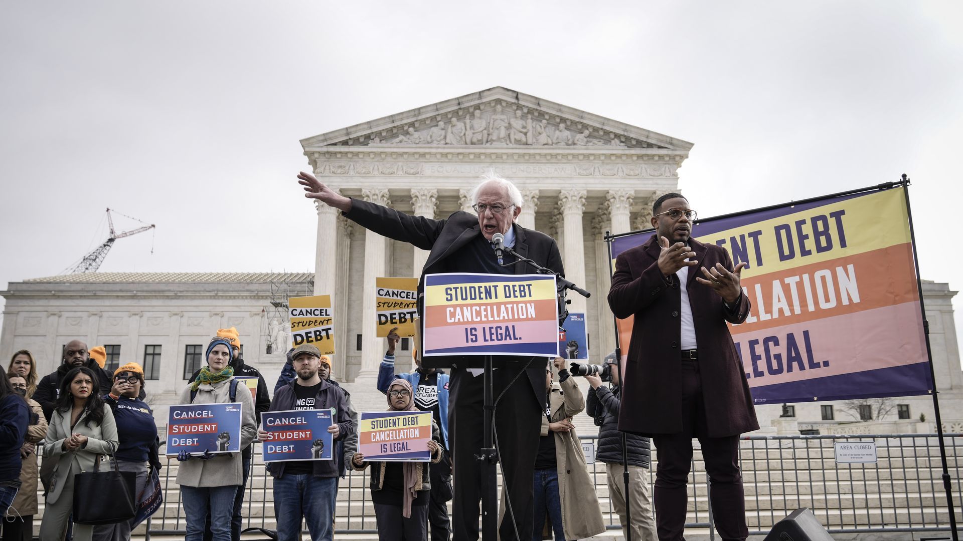 Sen. Bernie Sanders (I-VT) speaks during a rally in support of the Biden administration's student debt relief plan in front of the Supreme Court today. Photo: Drew Angerer/Getty Images